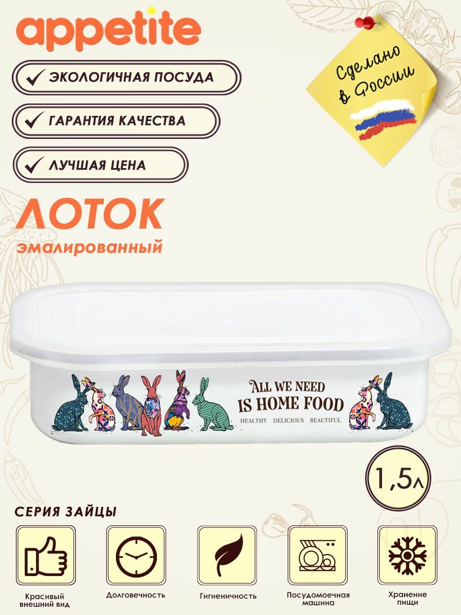 | Комплектация | Лоток эмалированный 1,5л. с крышкой Зайцы ТМ Appetite |