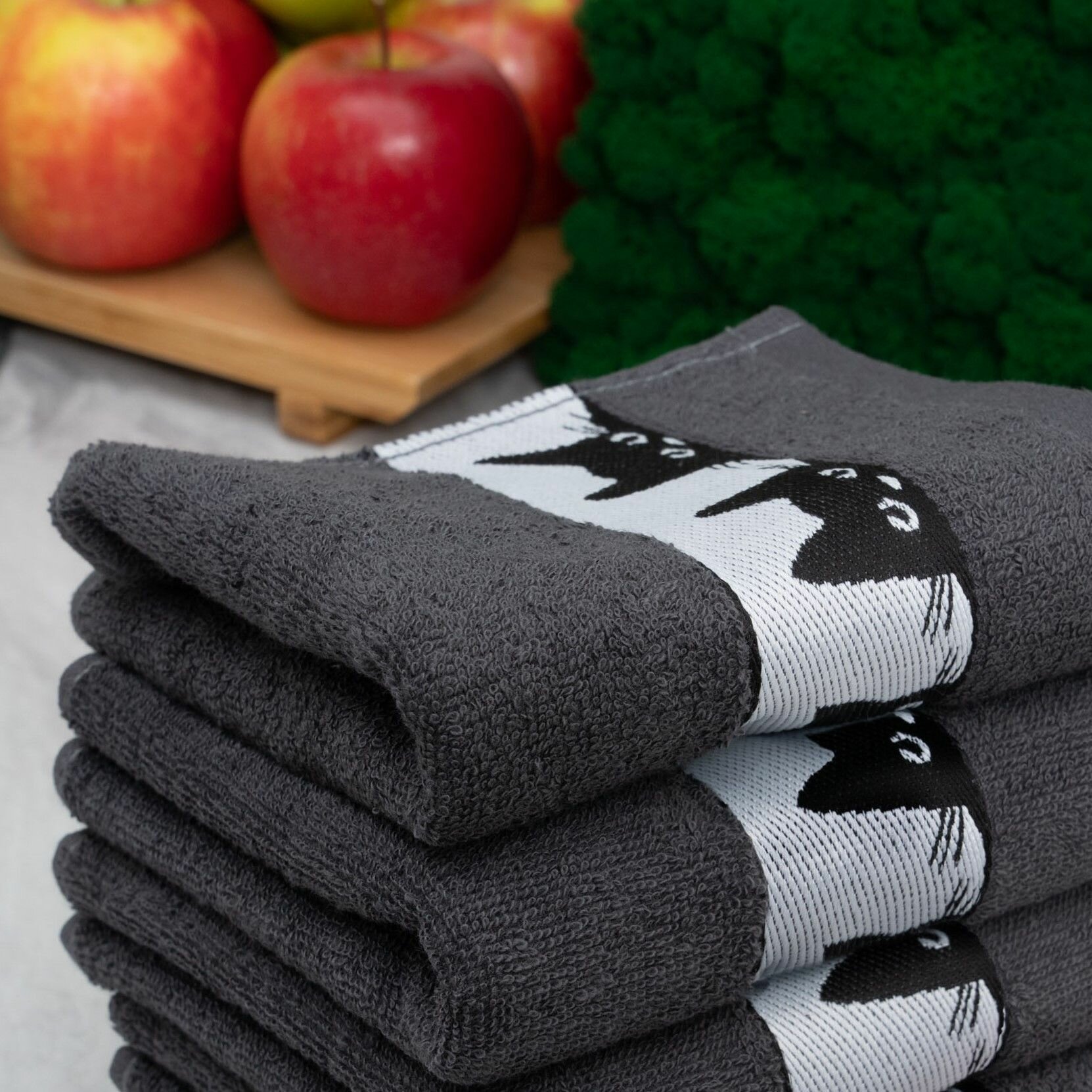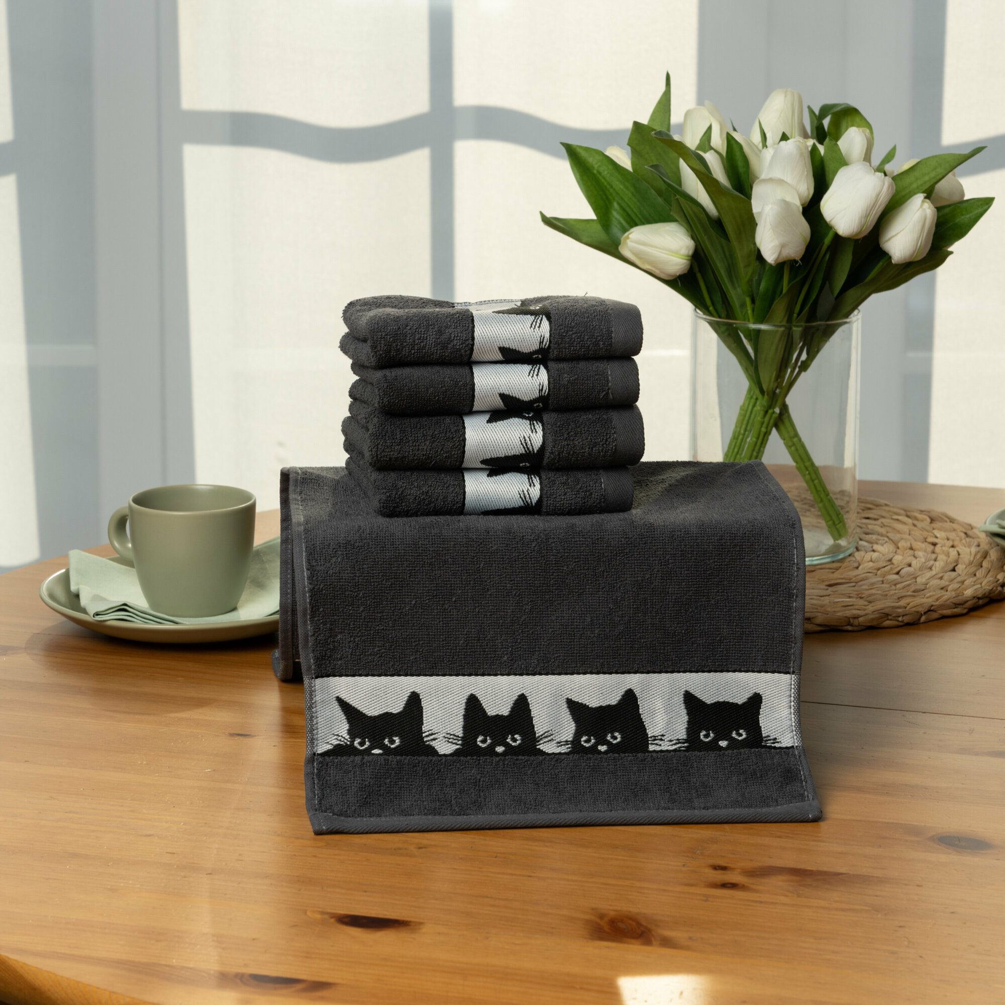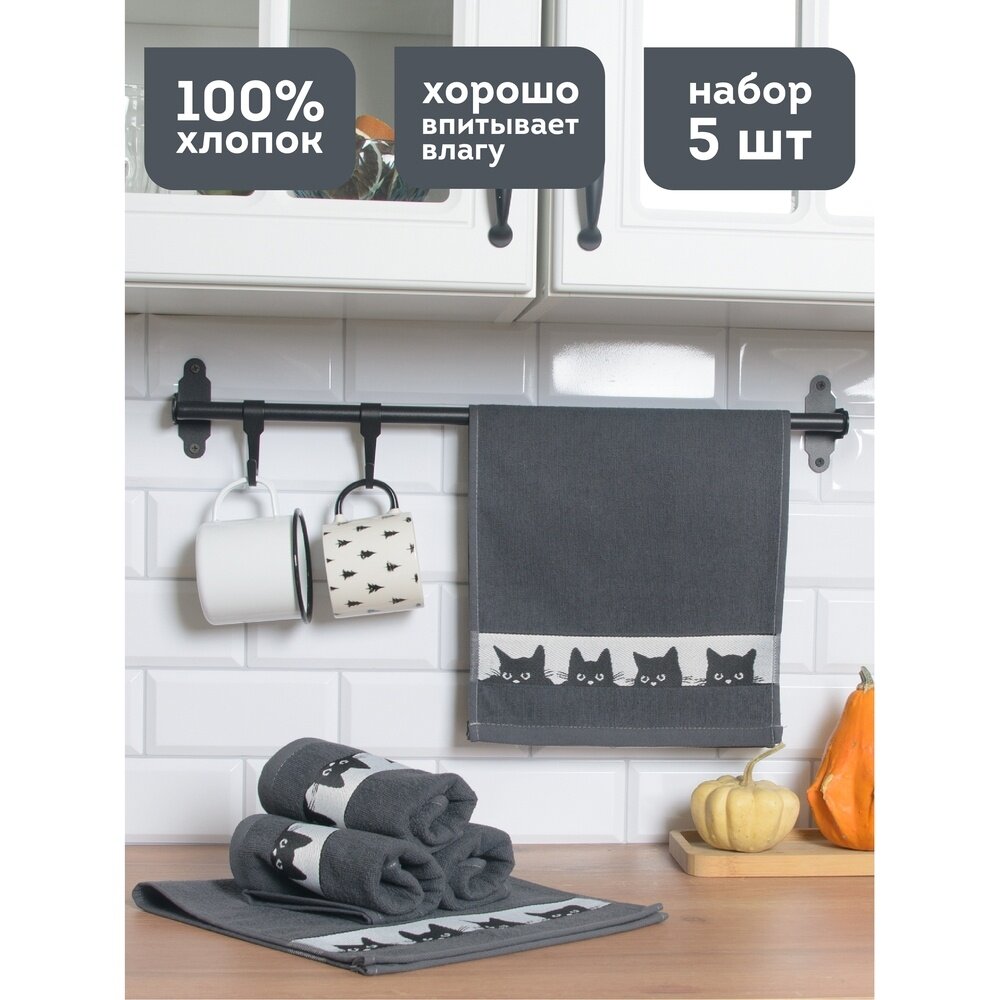 Купить Полотенца махровые кухонные, 30х60 см, набор 5 шт, Китчен Котики, темно-серые