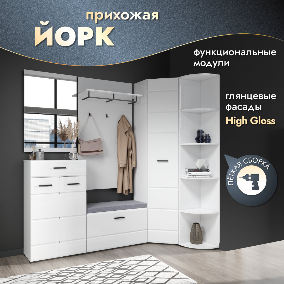 Прихожая Йорк угловая со шкафом зеркалом вешалкой обувницей белый глянец ШГВ (236х62х205 см) интересное: