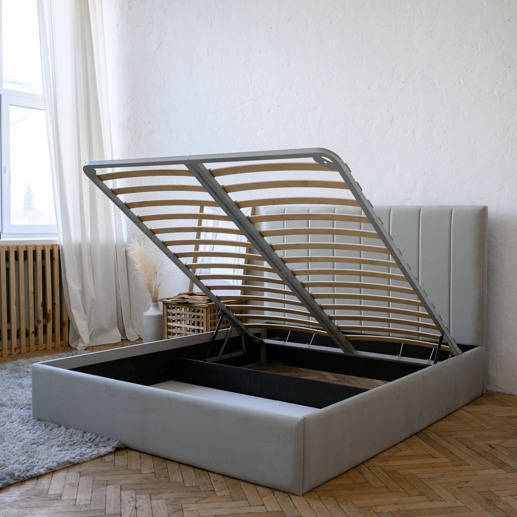 Кровать 160х200 двуспальная Маргарида, с подъёмным механизмом, с ящиками, с мягким изголовьем, светло-серая