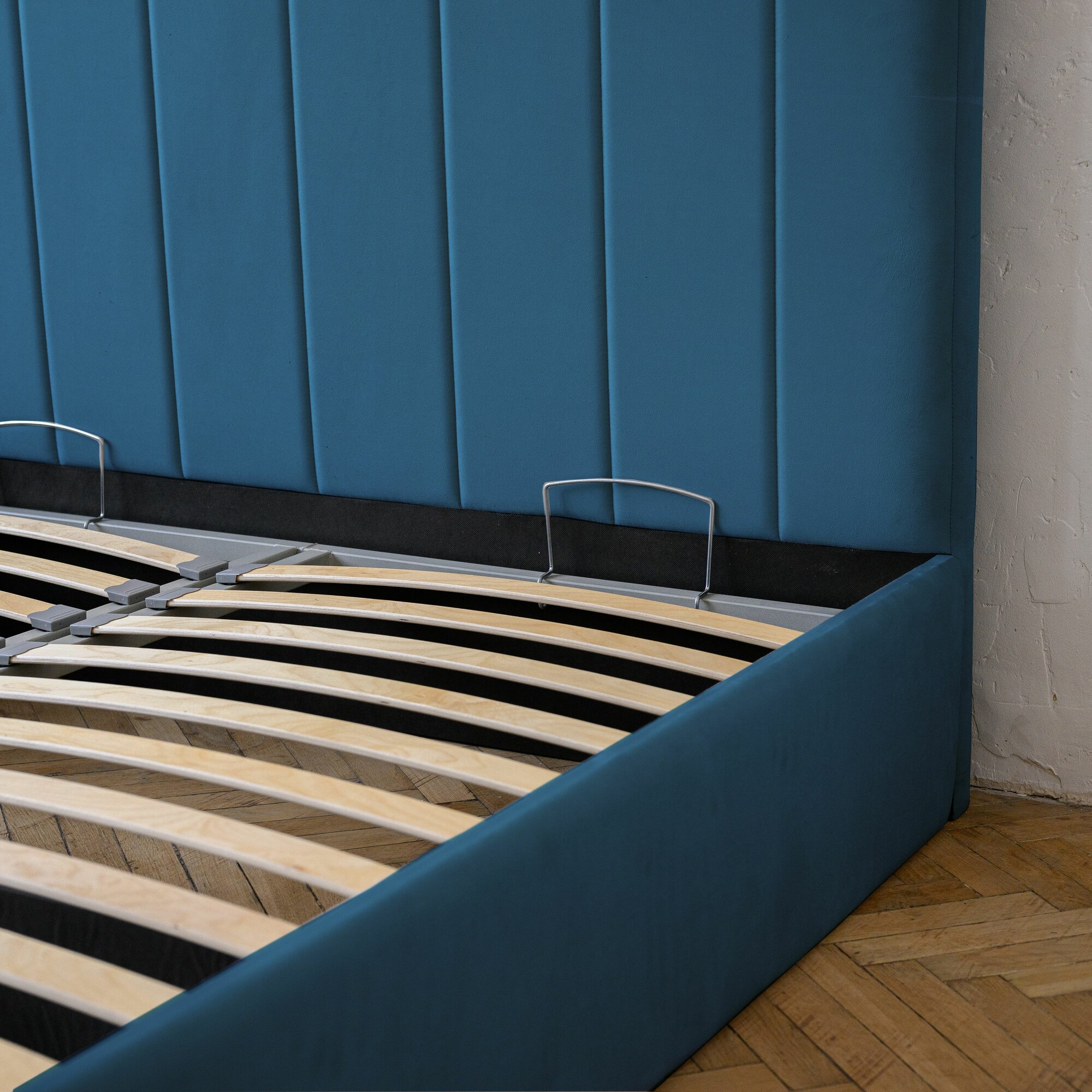 Кровать 160х200 двуспальная Маргарида, с подъёмным механизмом, с ящиками, с мягким изголовьем, синяя