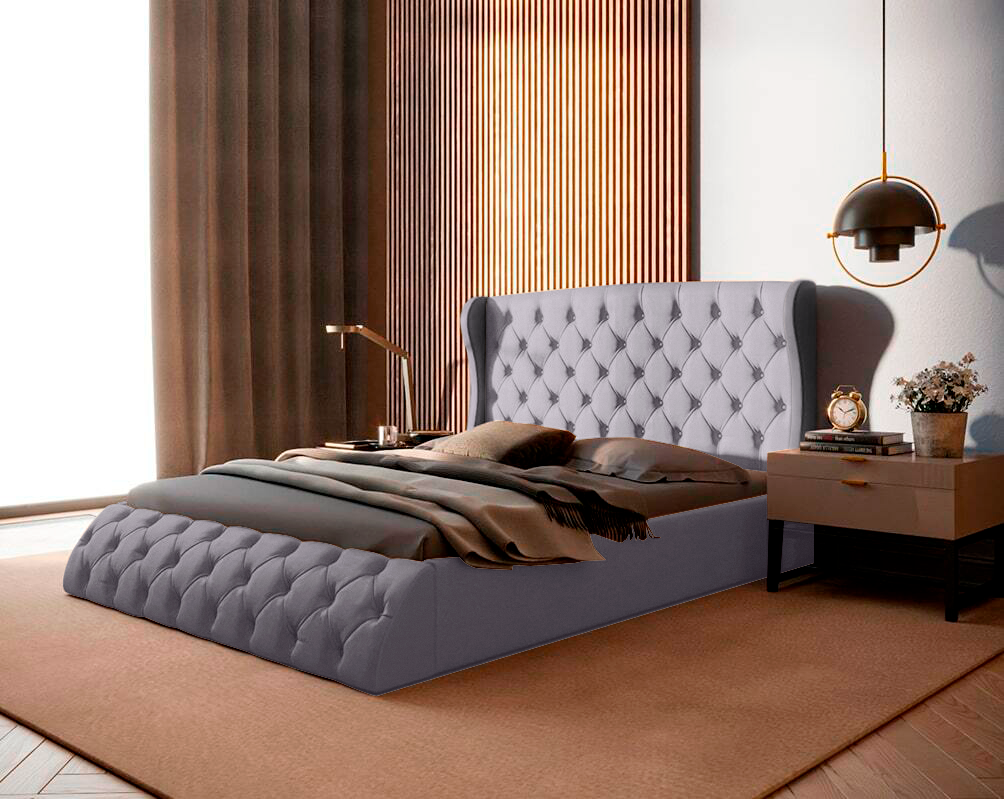 Двуспальная кровать 200x200, Lavr, с мягким изголовьем, с ящиком, велюр, серый