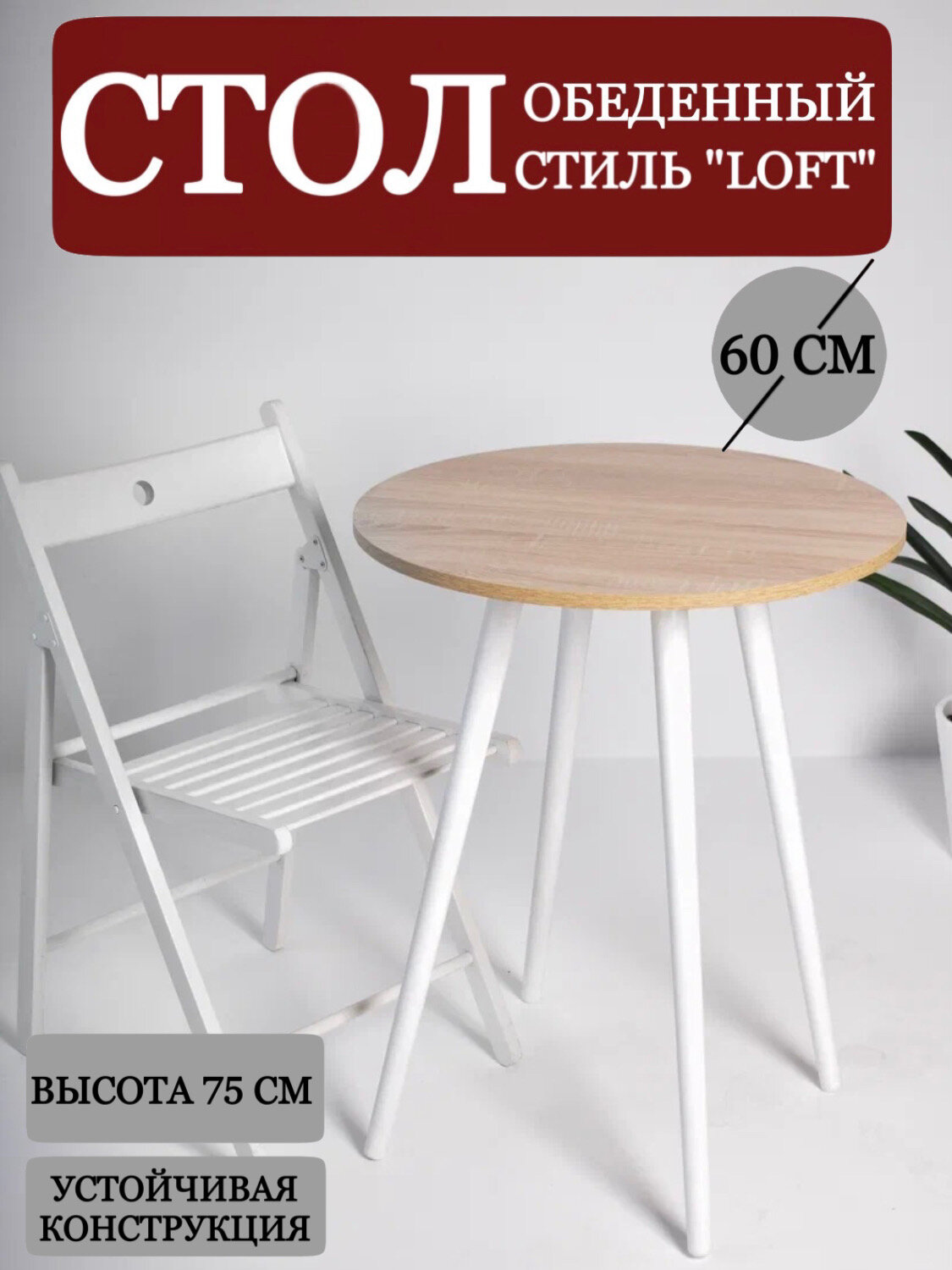 Стол кухонный лофт обеденнный круглый, подстолье - ножки дерево "Дуб", ЛДСП цвет белый, 60х75 см