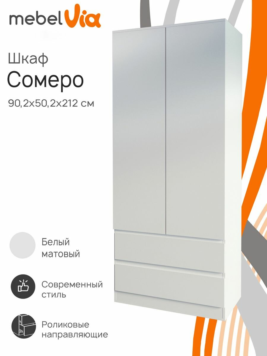 Шкаф 2-х дверный Somero, 2 выдвижных ящика, ЛДСП, белый, 90,2х50,2х212 см, MebelVia