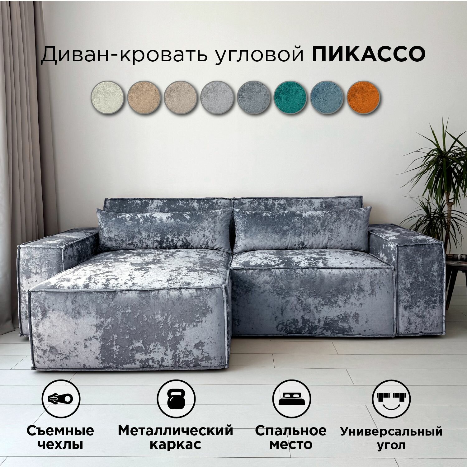 Диван-кровать Redsofa Пикассо 260 см серебристый Ocean. Раскладной угловой диван со съемными чехлами, для дома и офиса (Мебельный гарнитур бытового назначения)