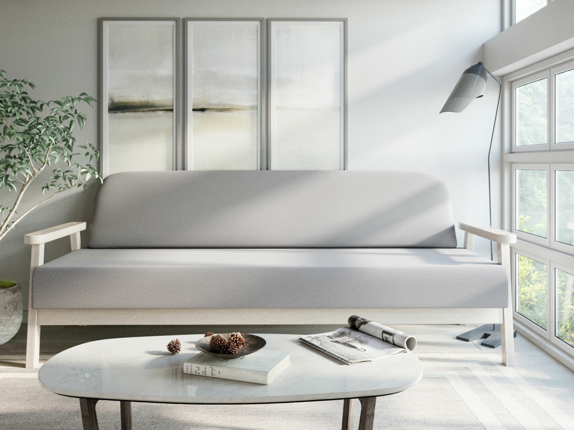 Купить Прямой диван флори-б серый-беленый дуб, велюр, деревянный, трехместный, офисный, в гостиную, на ножках, скандинавский лофт