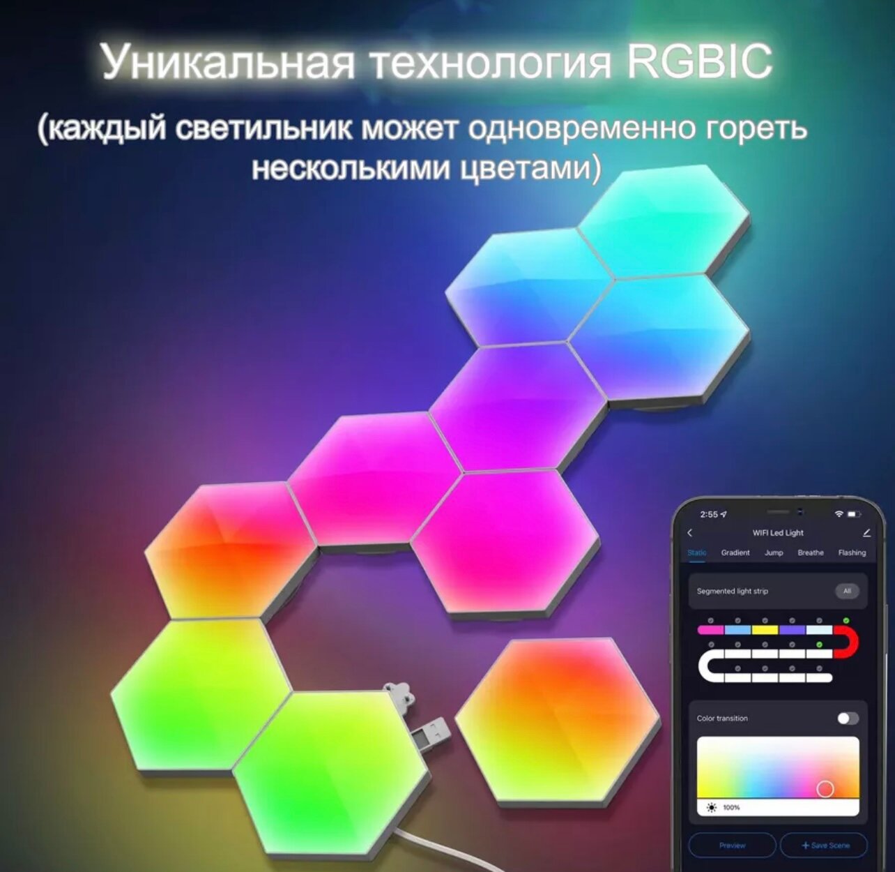 Умный RGB модульный, декоративный светильник "соты" со светомузыкой 8 шт интересное: