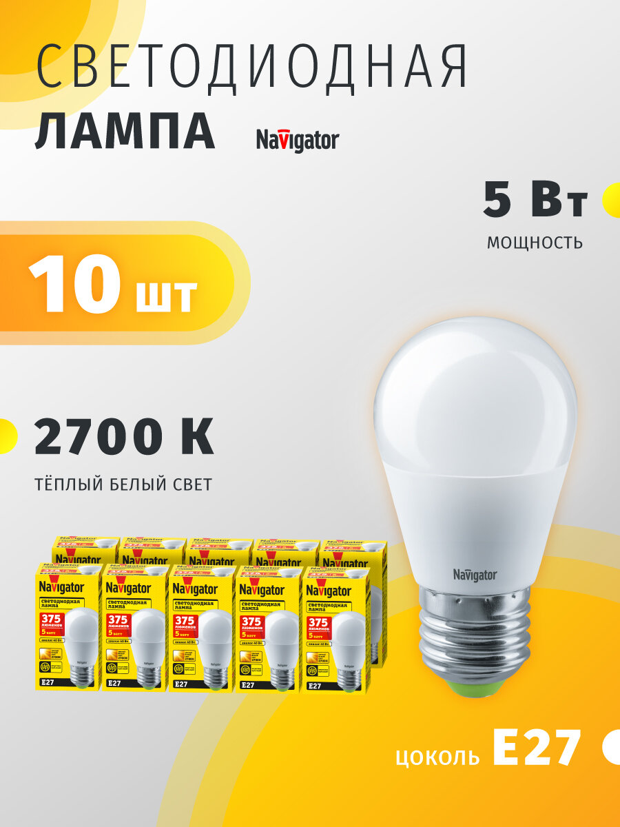 Купить Лампа светодиодная Navigator 94 477, 5 Вт, шар, Е27, теплый свет 2700К, упаковка 10 шт.