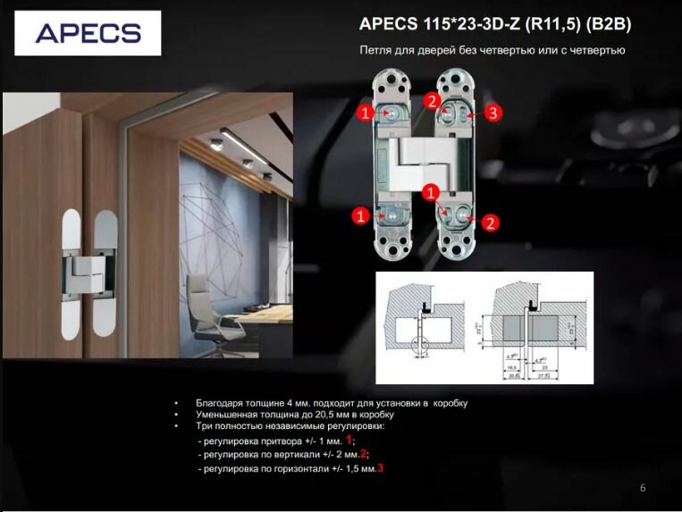 Петля скрытая 1 шт., Apecs, 115х23х6 мм, 3D-Z-CRM R1,5 B2B, 32702, хром матовая, полимер покр интересное: