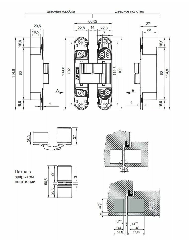 Петля невидимая / Петля скрытая универсальная Apecs 115*23-3D-Z-CRM матовый хром 60 кг