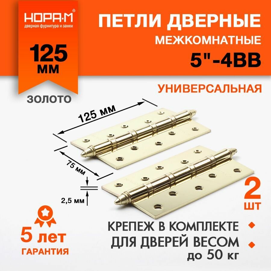 Петли дверные 2 шт. Нора-М 5"-4ВВ универсальные (125х75х2,5) - Матовое золото
