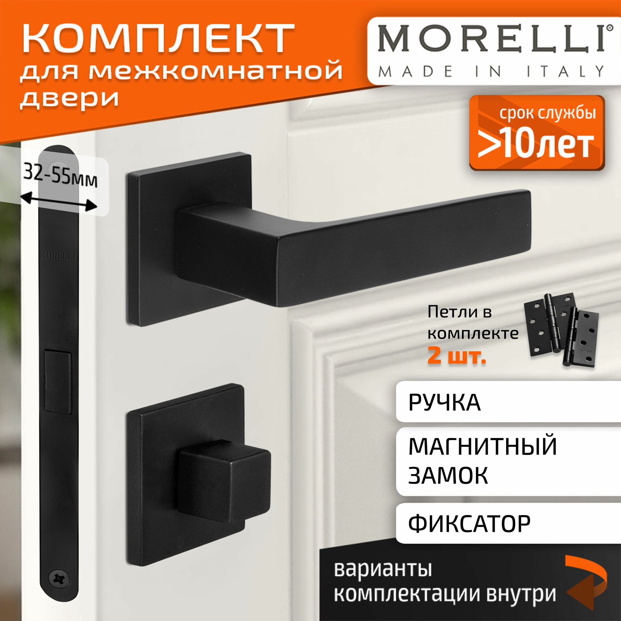 Комплект для межкомнатной двери Morelli / Дверная ручка MH 54 S6 BL + поворотник + бесшумный замок + врезные петли / черный матовый