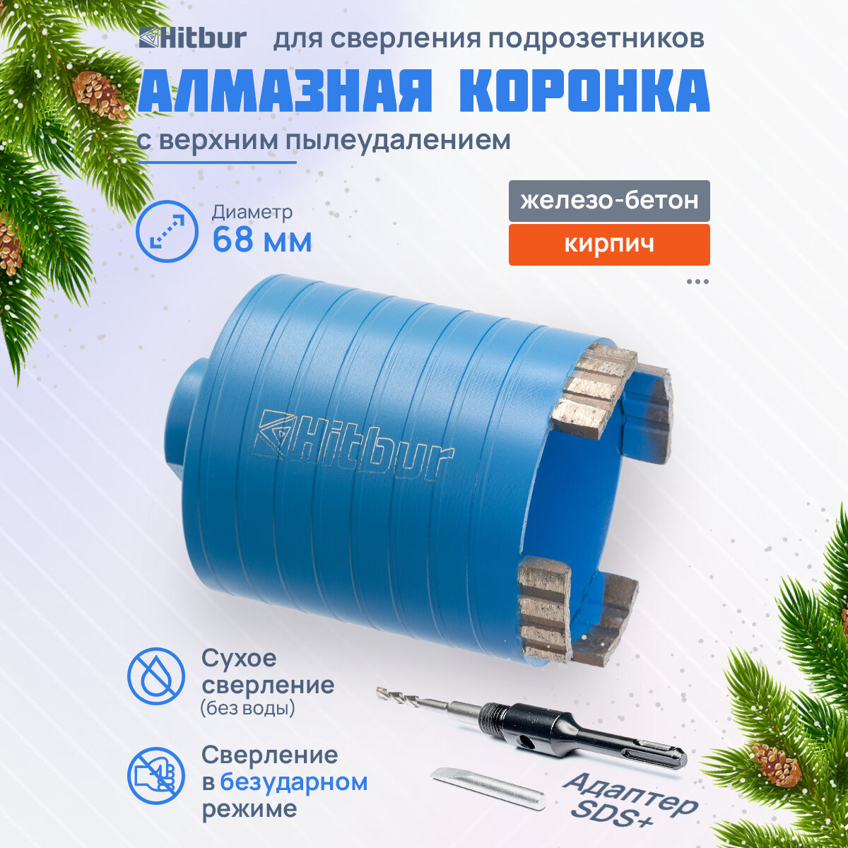 Коронка по бетону и кирпичу 68 мм алмазная для подрозетников Hitbur с верхним пылеудалением и держателем SDS Plus