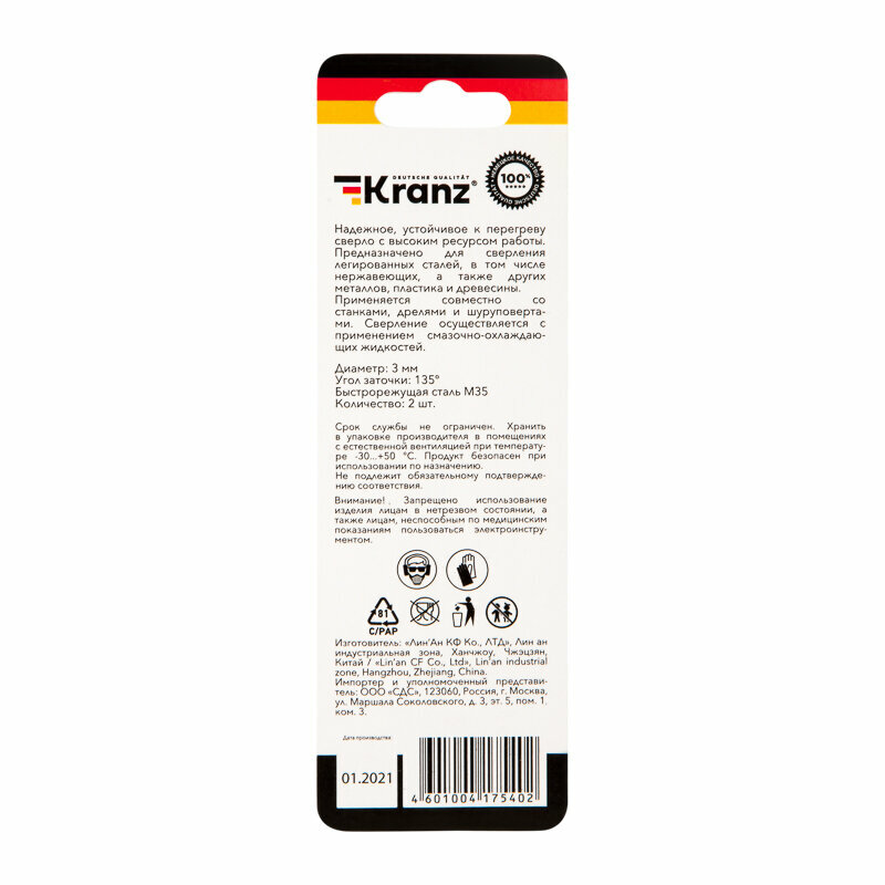 Сверло по металлу KRANZ 3 мм, с добавлением кобальта повышенной прочности, стандарт качества DIN 338 интересное: