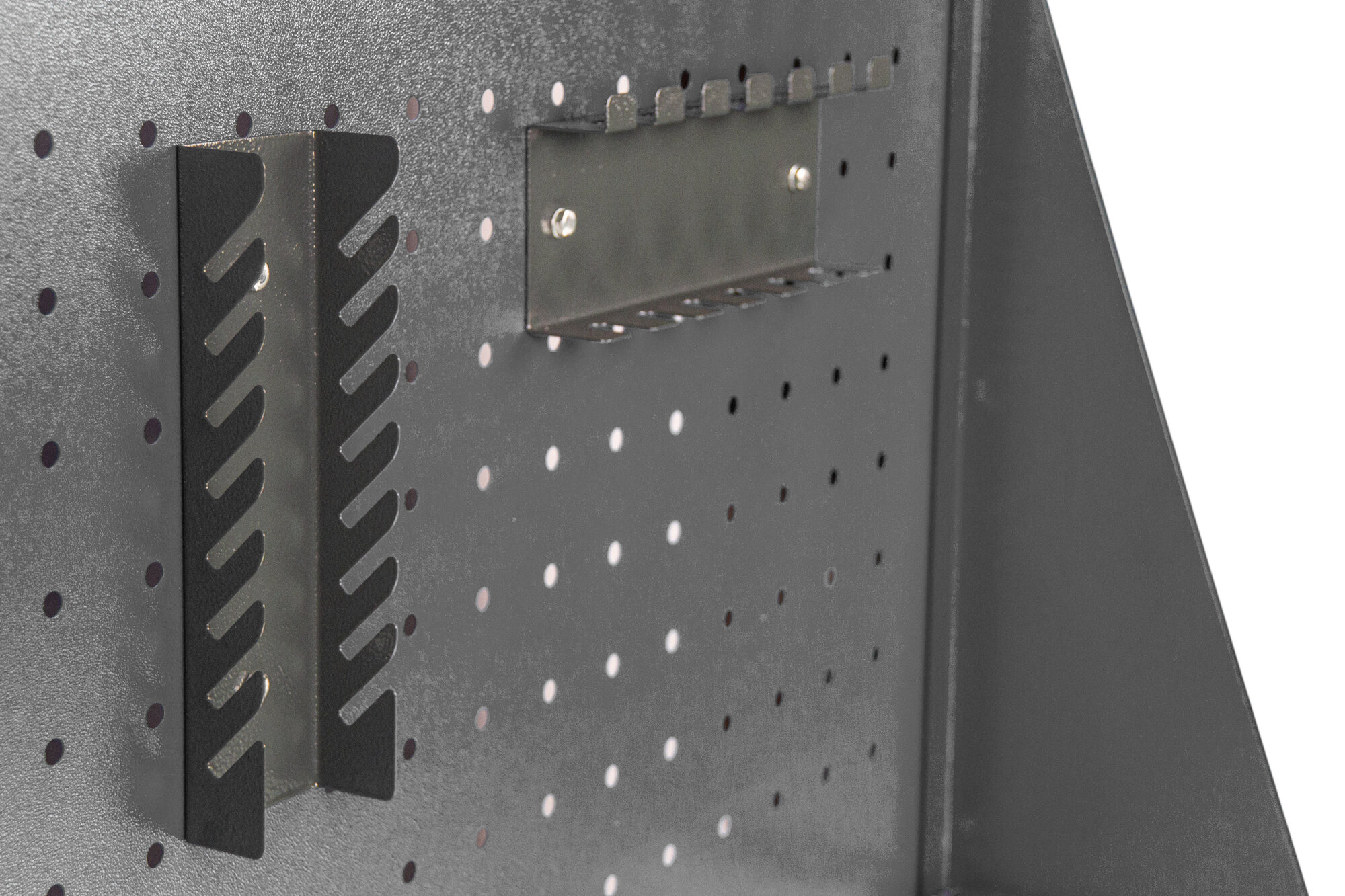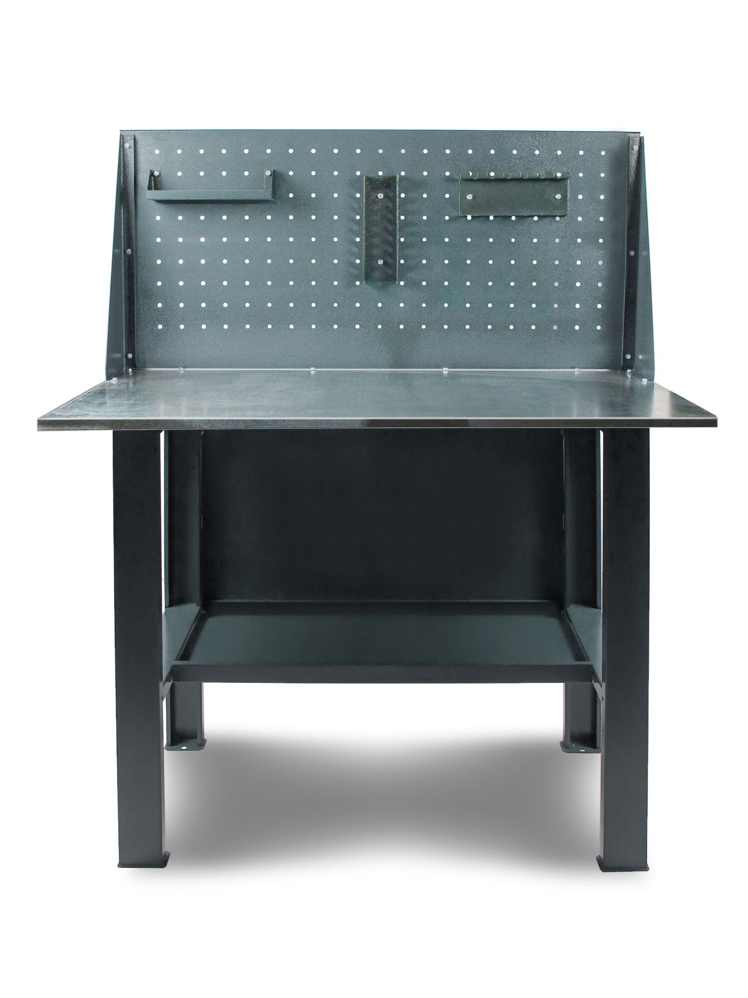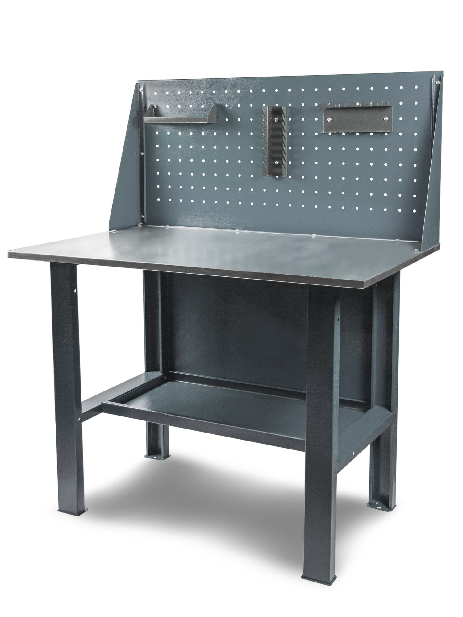 | Подробная комплектация | Стол слесарный состоит из опор, панелей, оснащен тремя полками для инструмента и метизов |