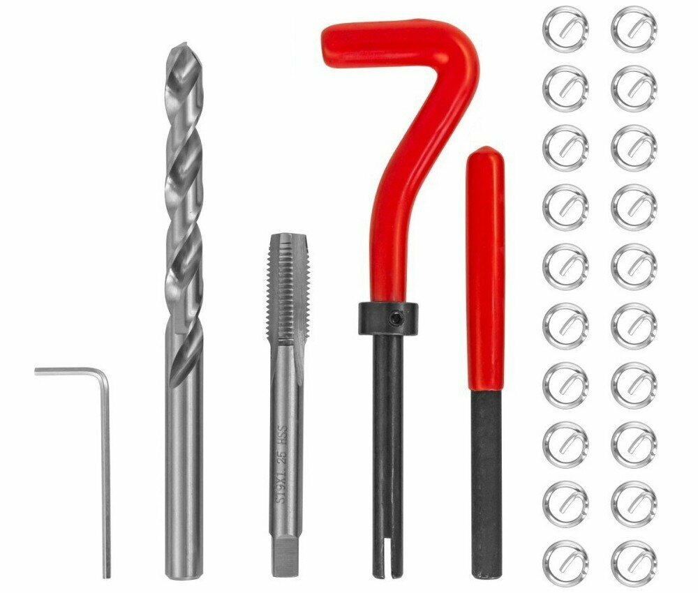 | Подробная комплектация | Сверло спиральное по металлу, по DIN 338 Метчик STI по DIN 8140-2Вороток установочный (с предохранительным кольцом для ограничения глубины)Демонтажная оправка (для удаления поводка) Ключ торцевой шестигранный Резьбовые вставки (25 шт.) |