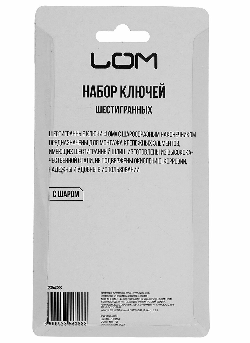 LOM Набор ключей шестигранных , с шаром, 1.5 - 10 мм, 9 шт. 2354388 интересное: