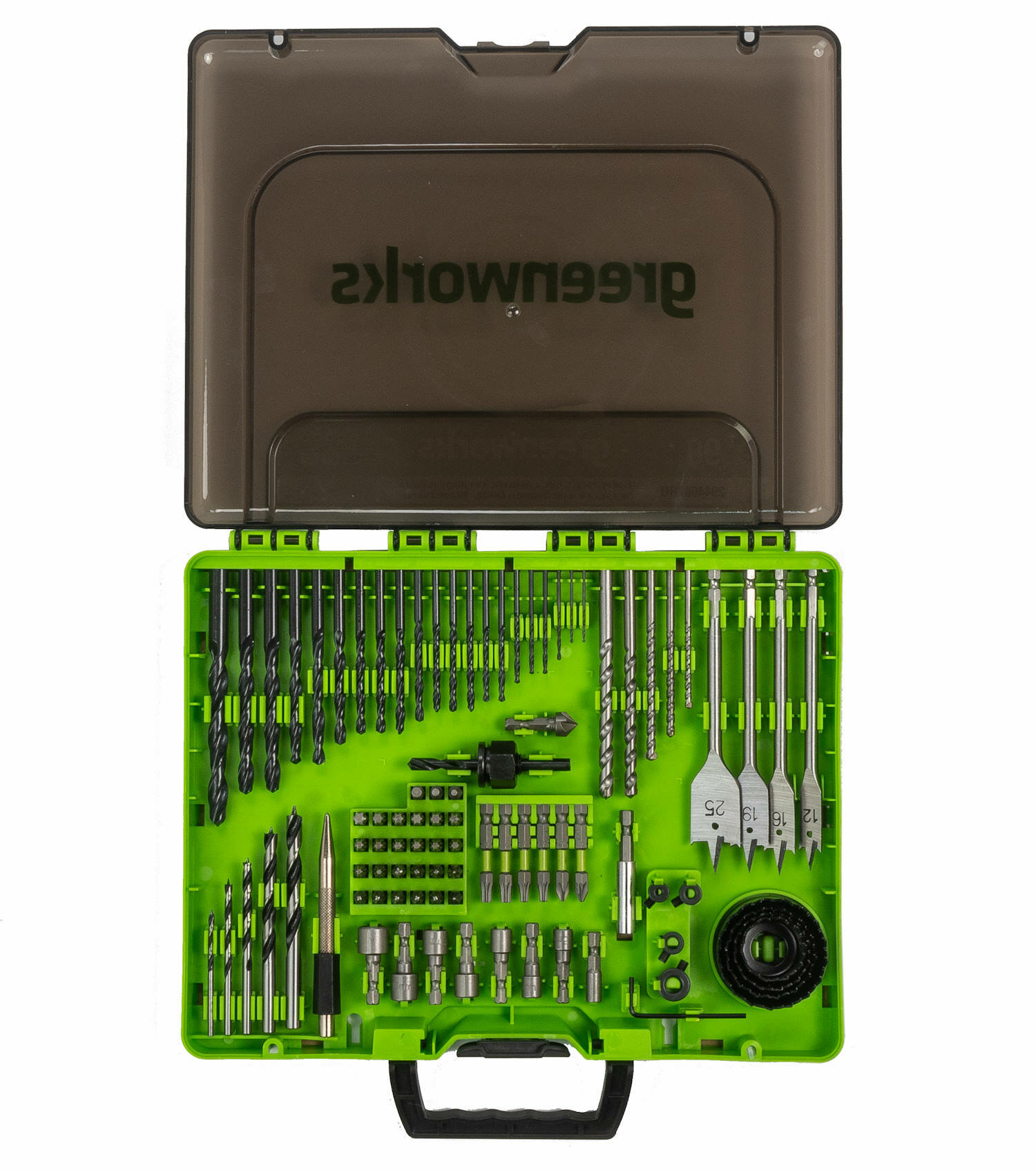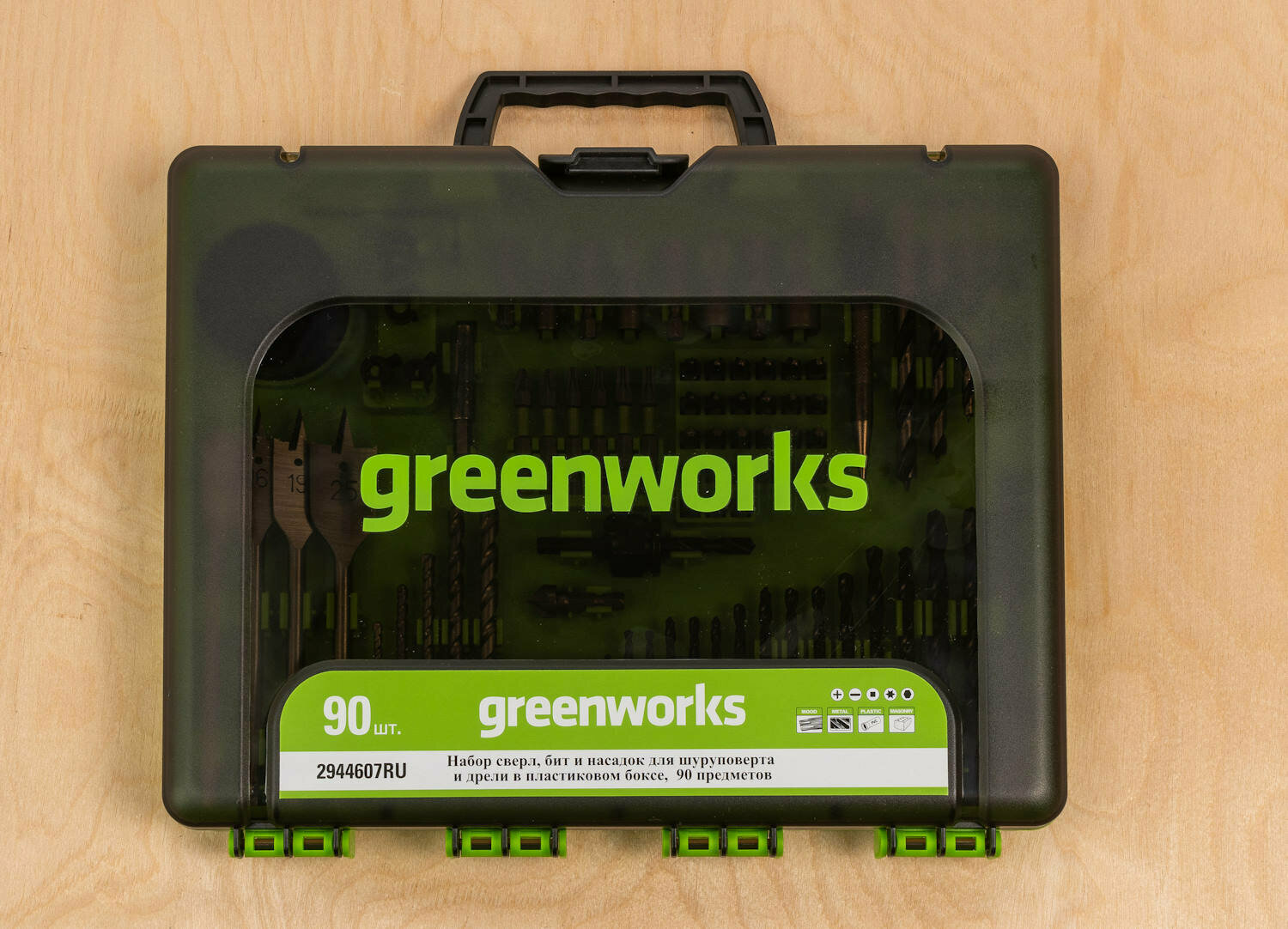 Набор сверл, бит и коронок в кейсе Greenworks 2944607 (90 шт.) интересное: