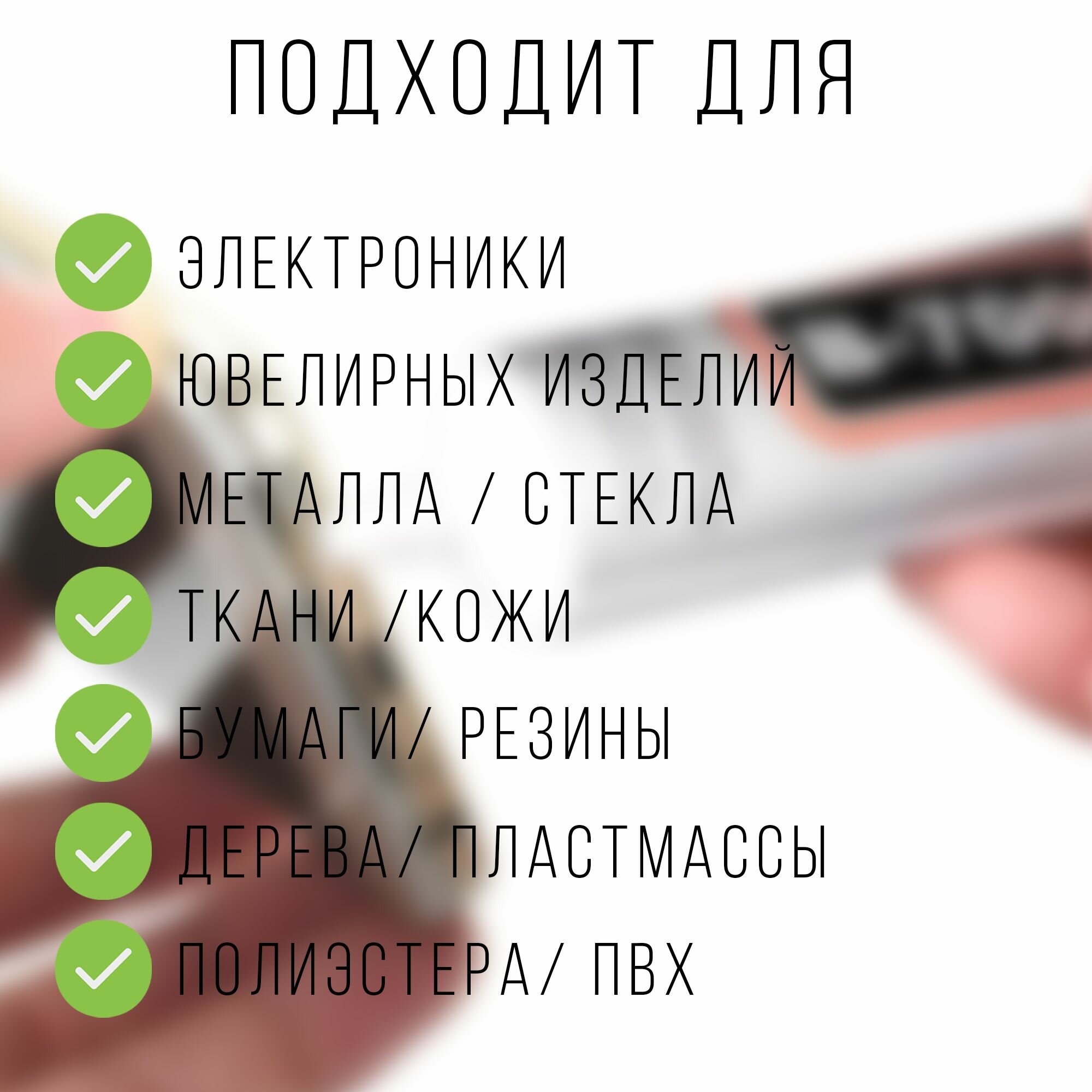 | Материалы для склеивания | EVA / ДСП / МДФ / ПВХ / бетон / бумага / дерево / камень / керамика / кирпич / кожа / металл / оргалит / оргстекло / пенополистирол / пластик / полиуретан / пробка / резина / стекло / текстолит / ткань / фарфор |