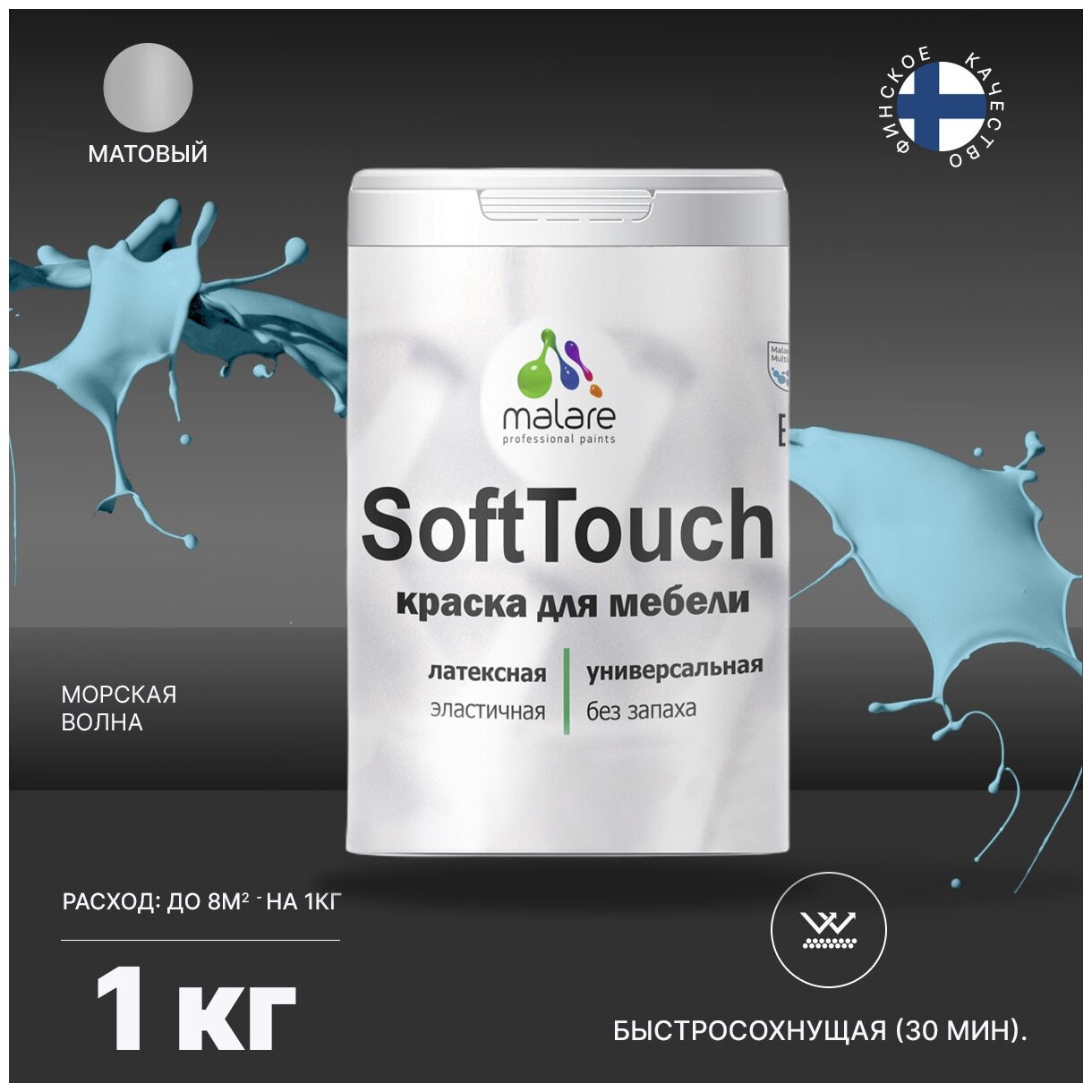 СохранитьАкриловая краска для мебели Malare SoftTouch для кухонных фасадов для дерева и МДФ, моющаяся быстросохнущая, матовая, морская волна, 1 кг. интересное: