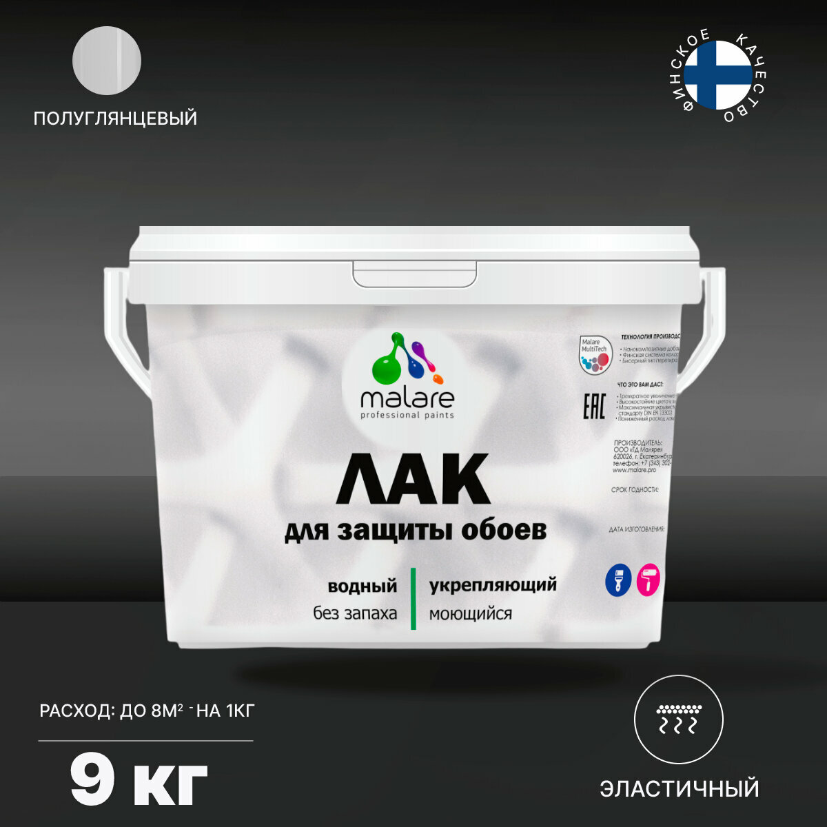 Лак для защиты обоев Malare Professional универсальный для дерева и минеральных поверхностей, водный без запаха быстросохнущий, бесцветный, полуглянцевый, 9 кг