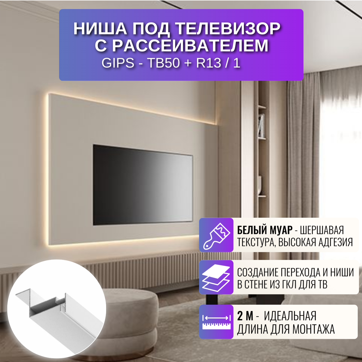 Ниша с рассеивателем для создании ниши под телевизор в стене, 2 м, 1 шт, цвет белый