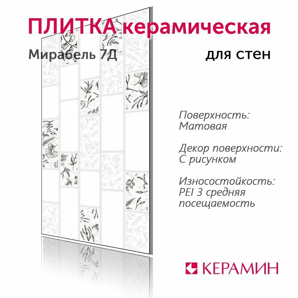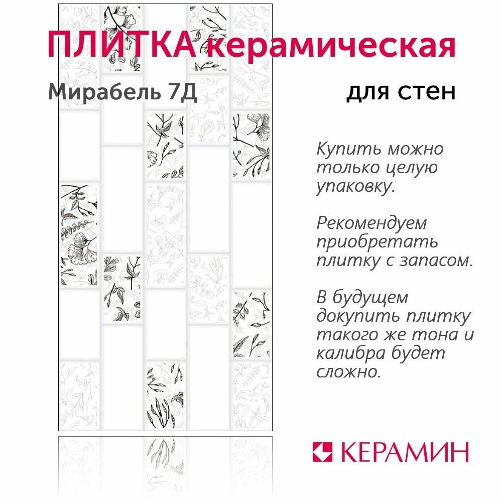 Ниже Вы можете прочитать отзывы на Плитка керамическая Керамин Мирабель 7Д 60х30 см (11 шт. 1.98 м2), ознакомится с подробными характеристиками, посмотреть интересные обзоры и фотографии на Плитка керамическая Керамин Мирабель 7Д 60х30 см (11 шт. 1.98 м2).