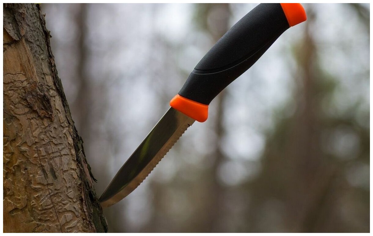 Нож туристический Morakniv Companion F серрейтор, нержавеющая сталь, прорезиненная рукоять с оранжевыми накладкам