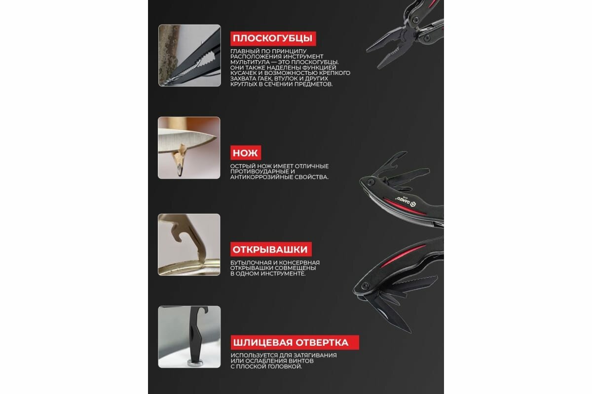 | Инструменты (функции) подробно | плоскогубцы кусачки нож нож серрейторный отвертка плоская отвертка плоская малая отвертка крестовая шило открывалка для бутылок консервный нож |