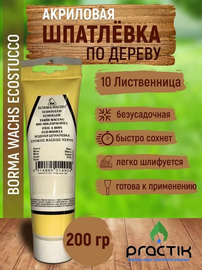 Шпаклёвка по дереву акриловая на водной основе безусадочная, в тубе, Borma Wachs Ecostucco 200гр., Лиственница 10, Быстро сохнет, легко шлифуется. интересное: