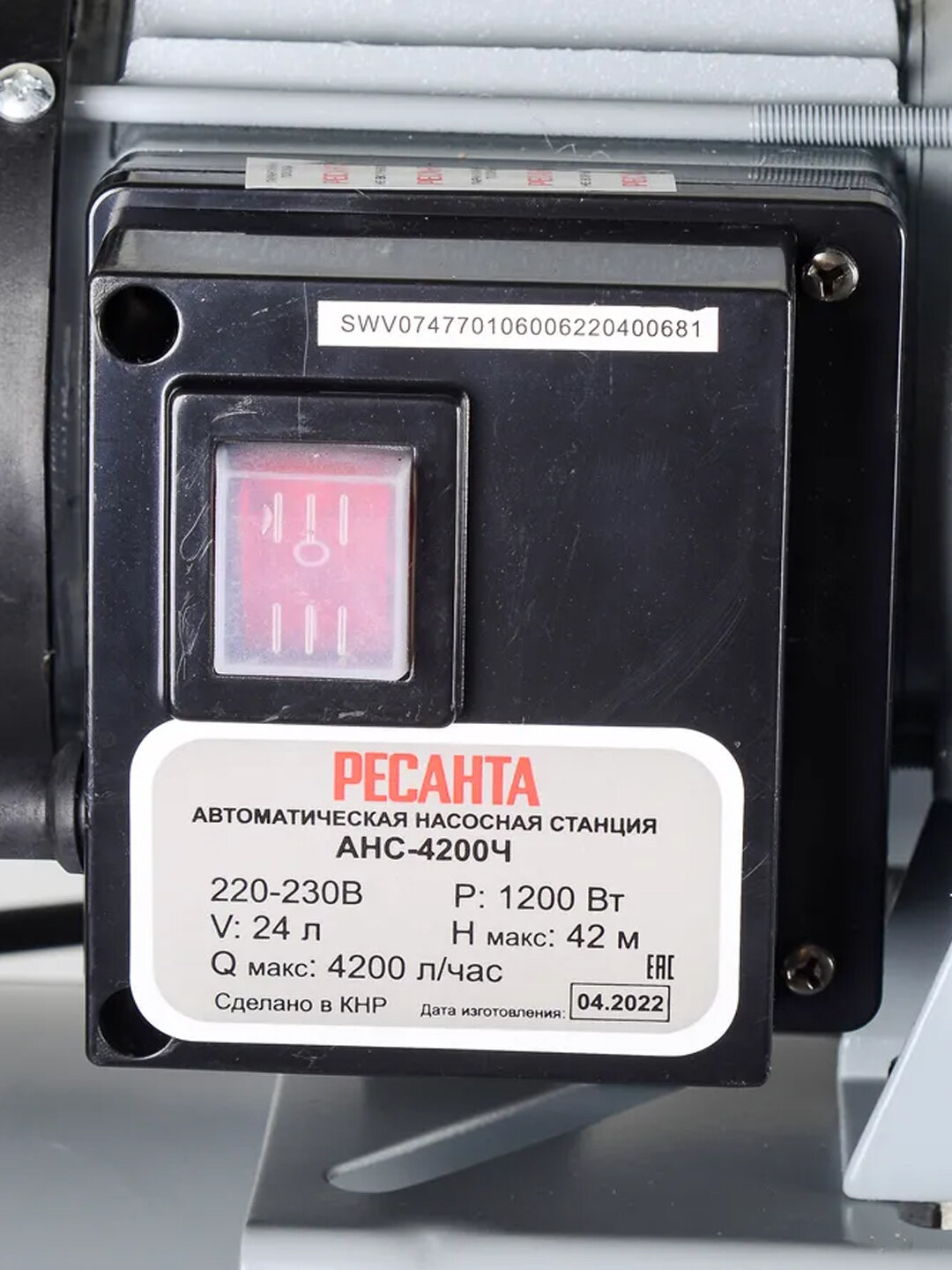 | Дополнительная информация | Реле с защитой от сухого хода Гибкая подводка большого диаметра Ресанта АНС-4200Ч 77/1/6 обеспечивает бесперебойное водоснабжение дома в автоматическом режиме Высокий напор и функция самовсасывания воды с глубины до 9 метров Класс защиты IP44 позволяет использовать насос во влажных помещениях: подвалах, хозяйственных блоках На корпусе расположен манометр для контроля уровня давления в системе |