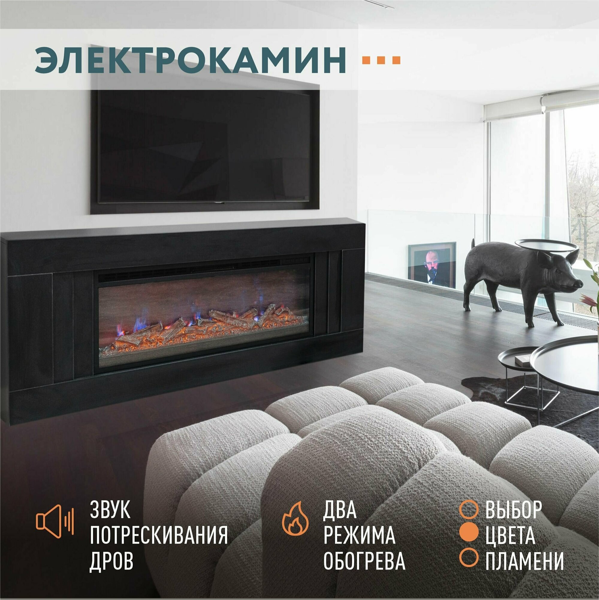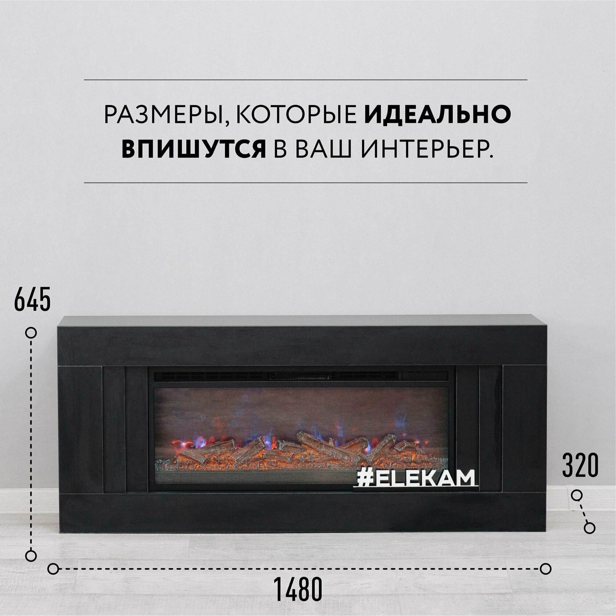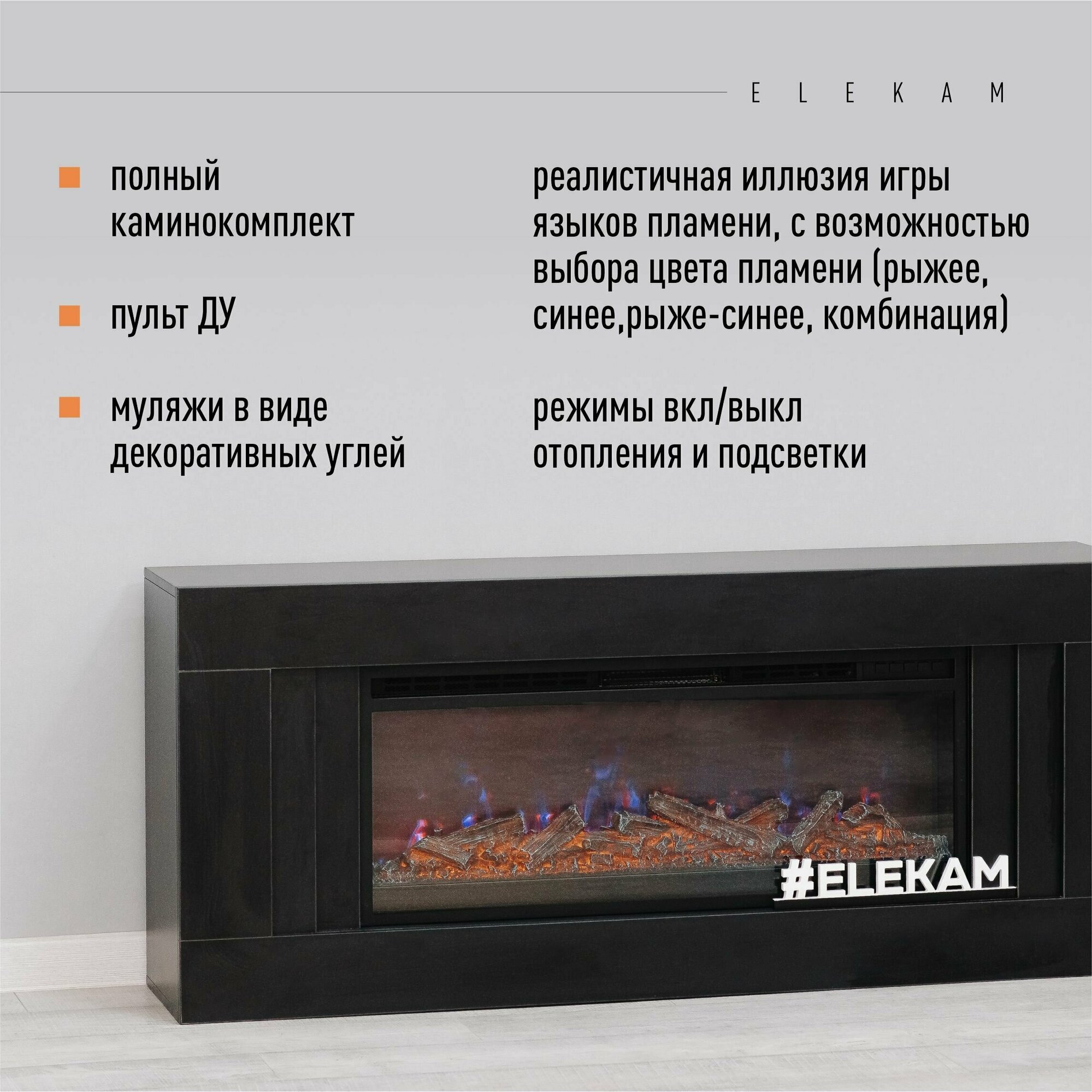 Камин электрический ELEKAM Lines чёрный с очагом Pulsar 38 с дровами с обогревом и звуком потрескивания (Электрокамин) интересное: