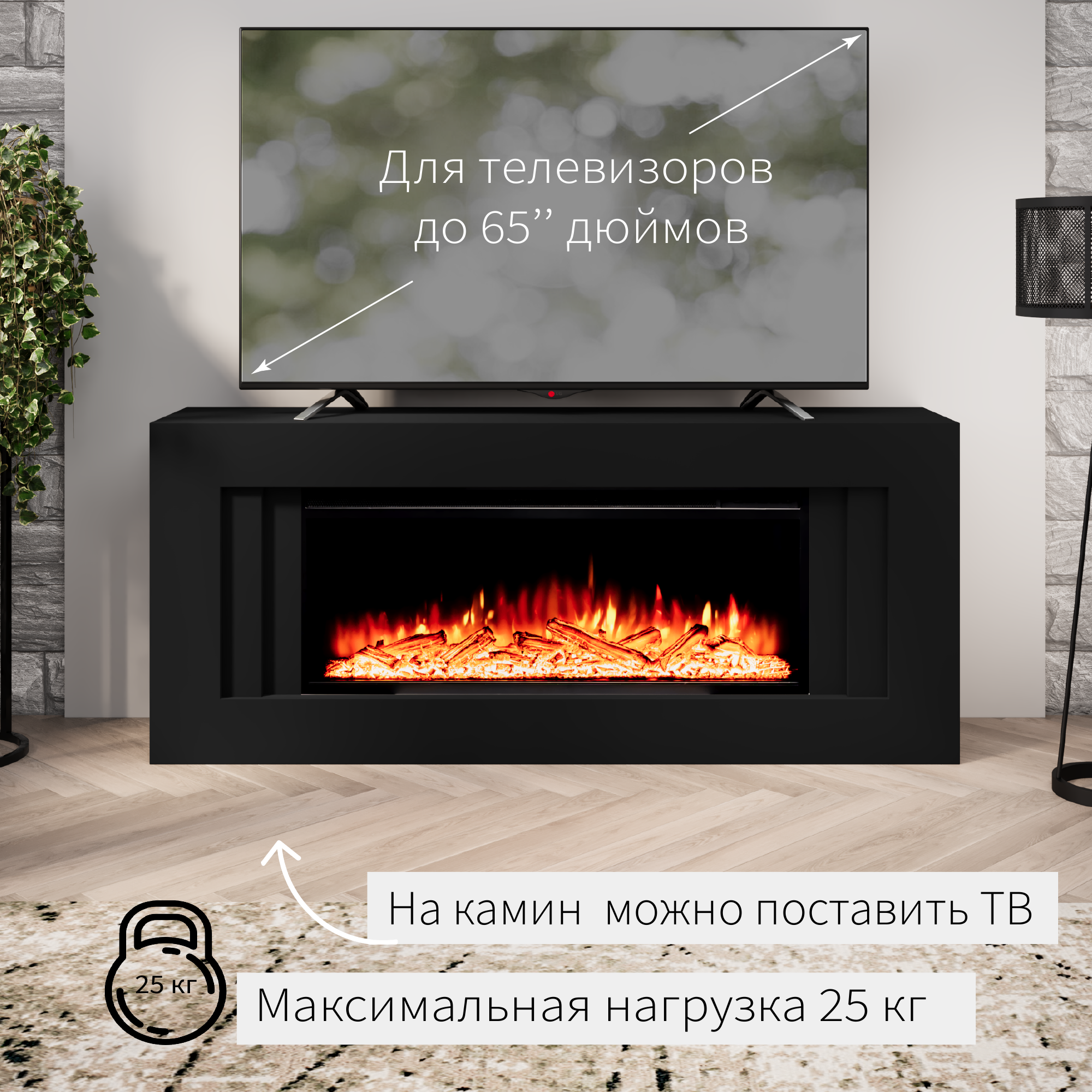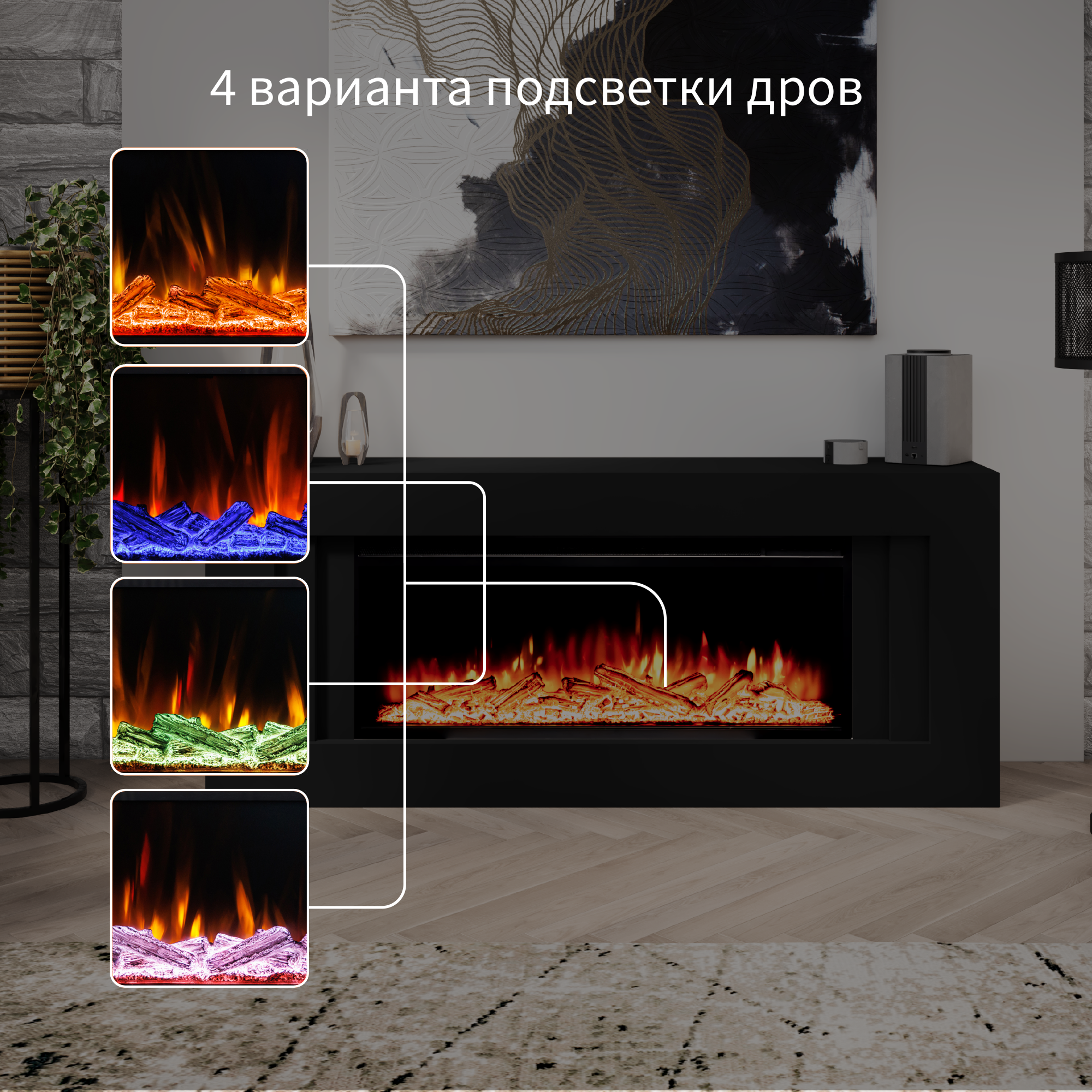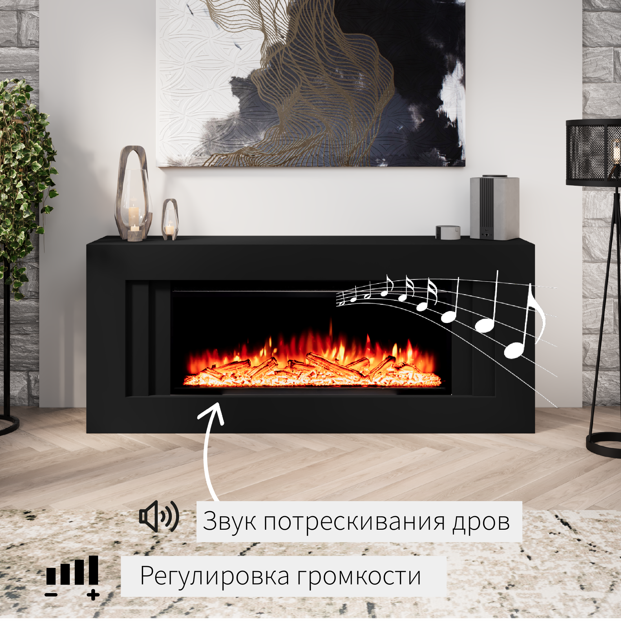 Камин электрический ELEKAM Lines чёрный с очагом Pulsar 38 с дровами с обогревом и звуком потрескивания (Электрокамин) интересное: