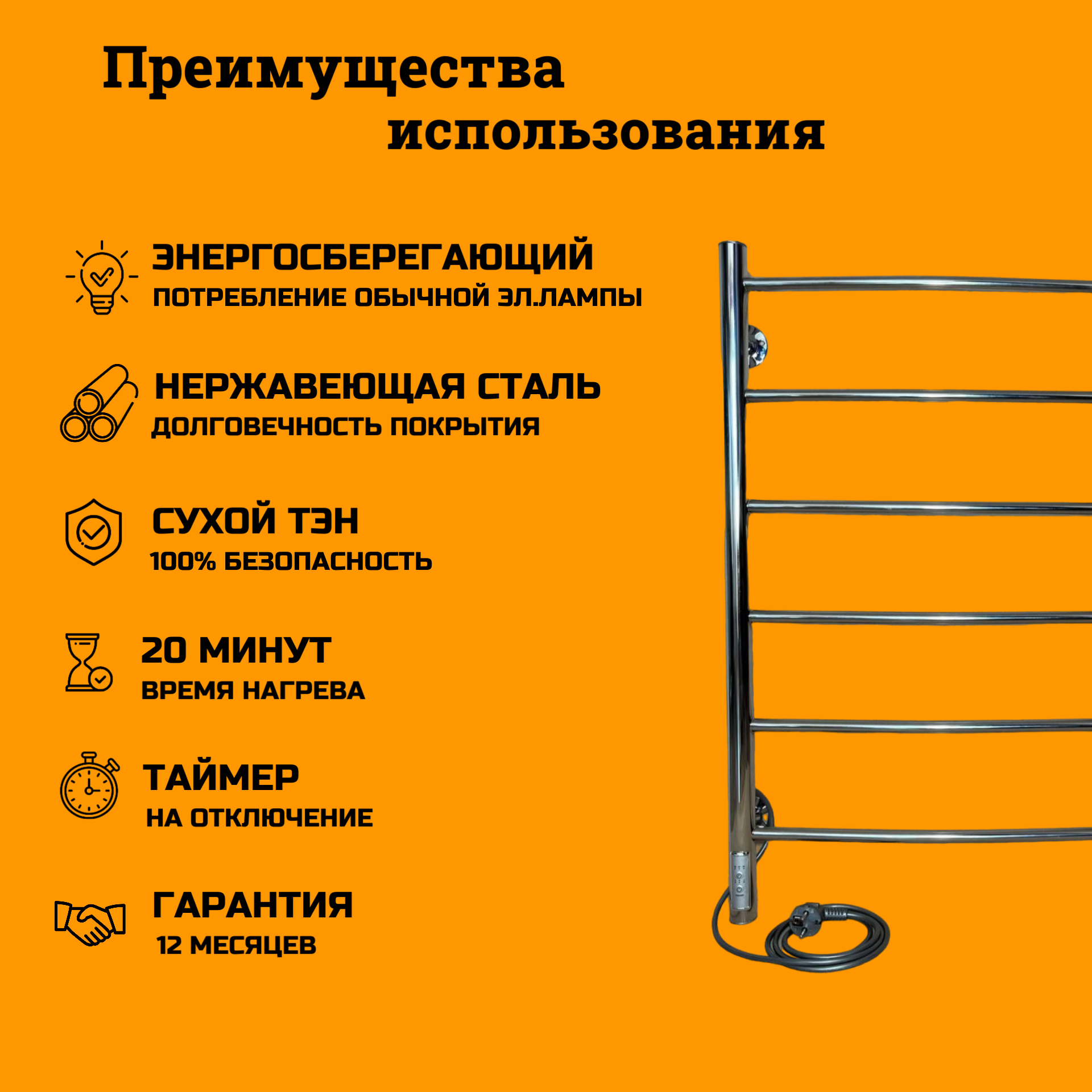 | Дополнительная информация | Функцию нагревательного элемента выполняет сухой греющий кабель - «сухой ТЭН». Максимальное время нагрева составляет 20 мин. Максимальная температура нагрева поверхности 60 С. Данная модель позволяет рационально расходовать электроэнергию, путем регулировки температуры терморегулятором и делает эксплуатацию полотенцесушителя удобной и рациональной, позволяя экономить до 30-40% энергии по сравнению с приборами, работающими постоянно. Температура нагрева регулируется в диапазоне 40-60 градусов ступенчато в 3х режимах: слабый нагрев 40 С, средний нагрев 50 С, максимальный нагрев 60 С. Так же есть возможность выставить таймер отключения. В соответствии с выбранным временем загорится соответствующий светодиод: 2 часа, 4 часа, 6 часов |