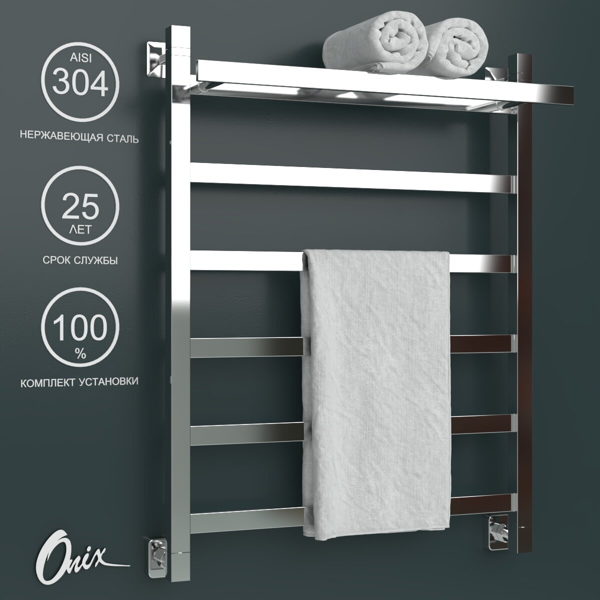Водяной полотенцесушитель Onix, модель Moon Plus 300x800, лесенка с полкой с нижним подключением, полный комплект