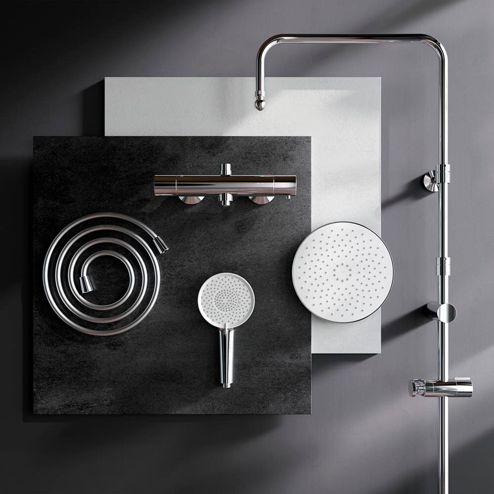 | Комплектация | верхний душ / держатель лейки / дивертор / душевая стойка / душевая штанга / лейка / набор эксцентриков / ручной душ / Смеситель / шланг |