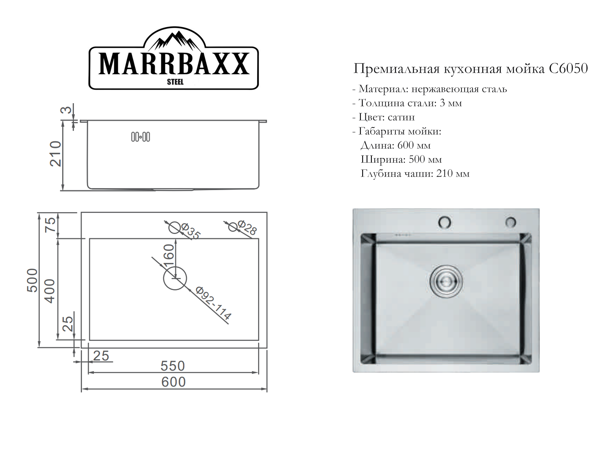 Мойка C6050-MR (Сатин) врезная/подстольная из нержавеющей стали с дозатором и коландером в комплекте интересное: