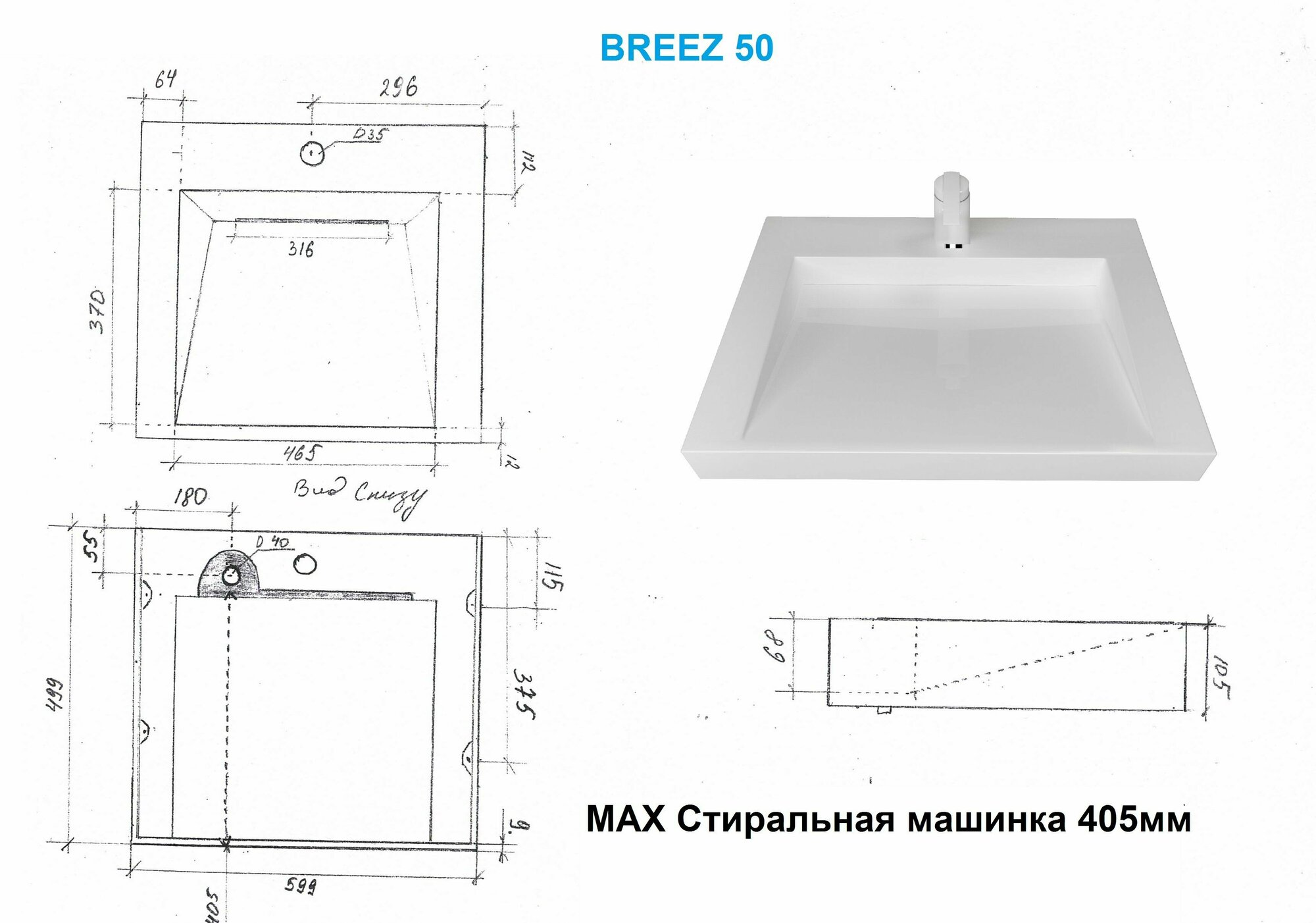Раковина над стиральной машиной Breez 50 белая, глянцевая, щелевой слив, с кронштейнами, сифоном интересное: