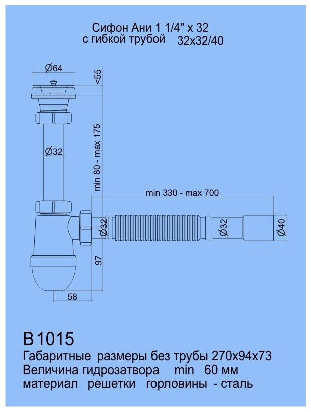 Сифон для умывальника бутылочный 1 1/4"x32 с гофрой 32х32/40 выпуск с нержавеющей решёткой D=65мм АНИ Юнг АНИ Пласт BM1015