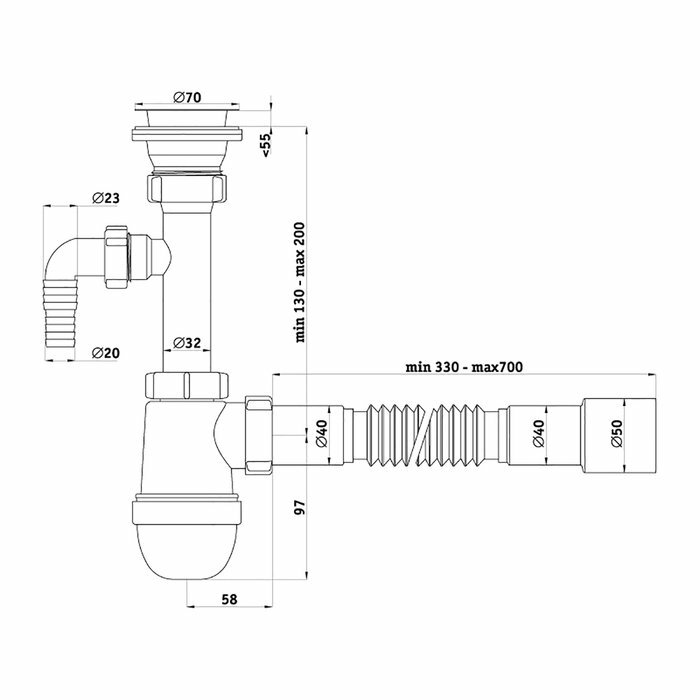 Сифон для мойки большая горловина с переливом, с отводом под сливной шланг и со съёмной корзинкой для мусора