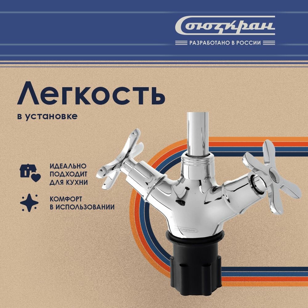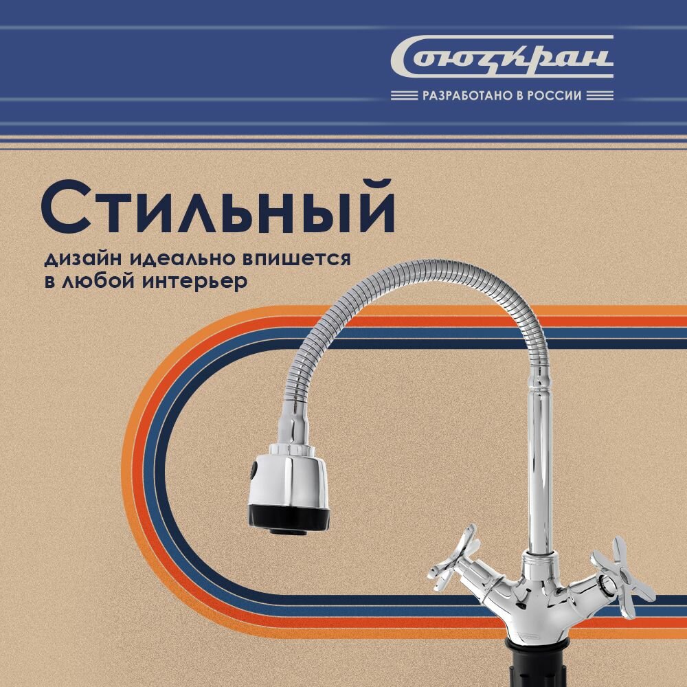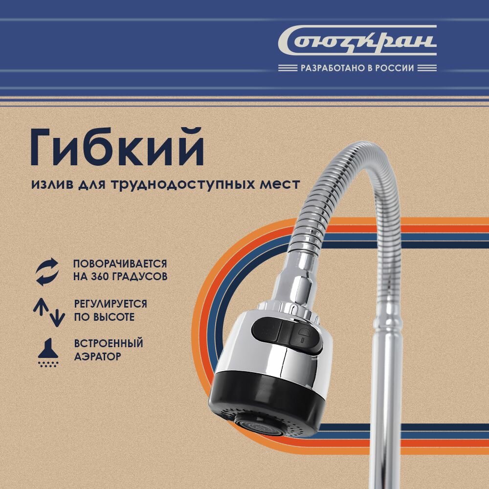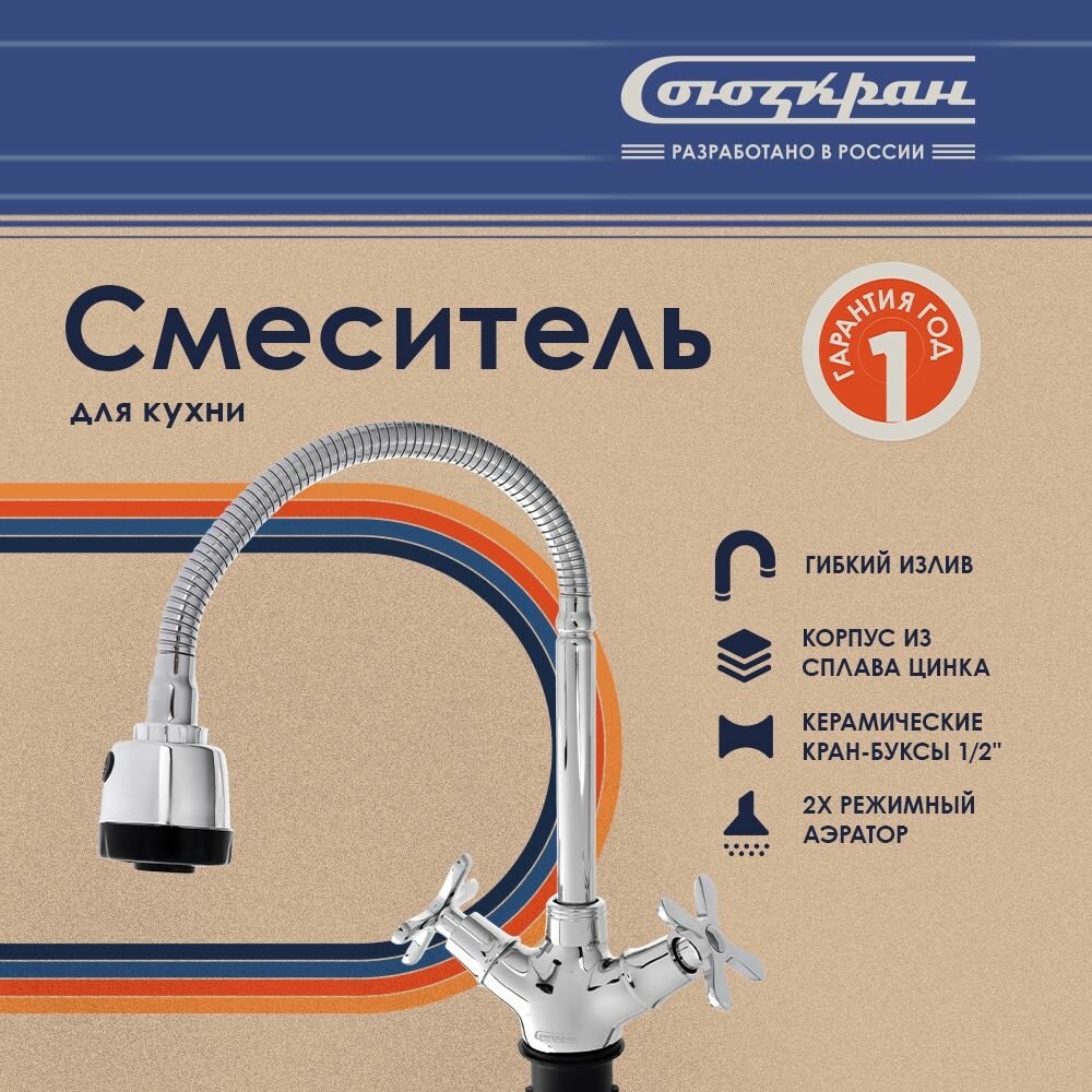 Смеситель для кухни СоюзКран, гибкий излив, керам. кран-буксы 1/2, хром, цинк, SK01-F240 NEW