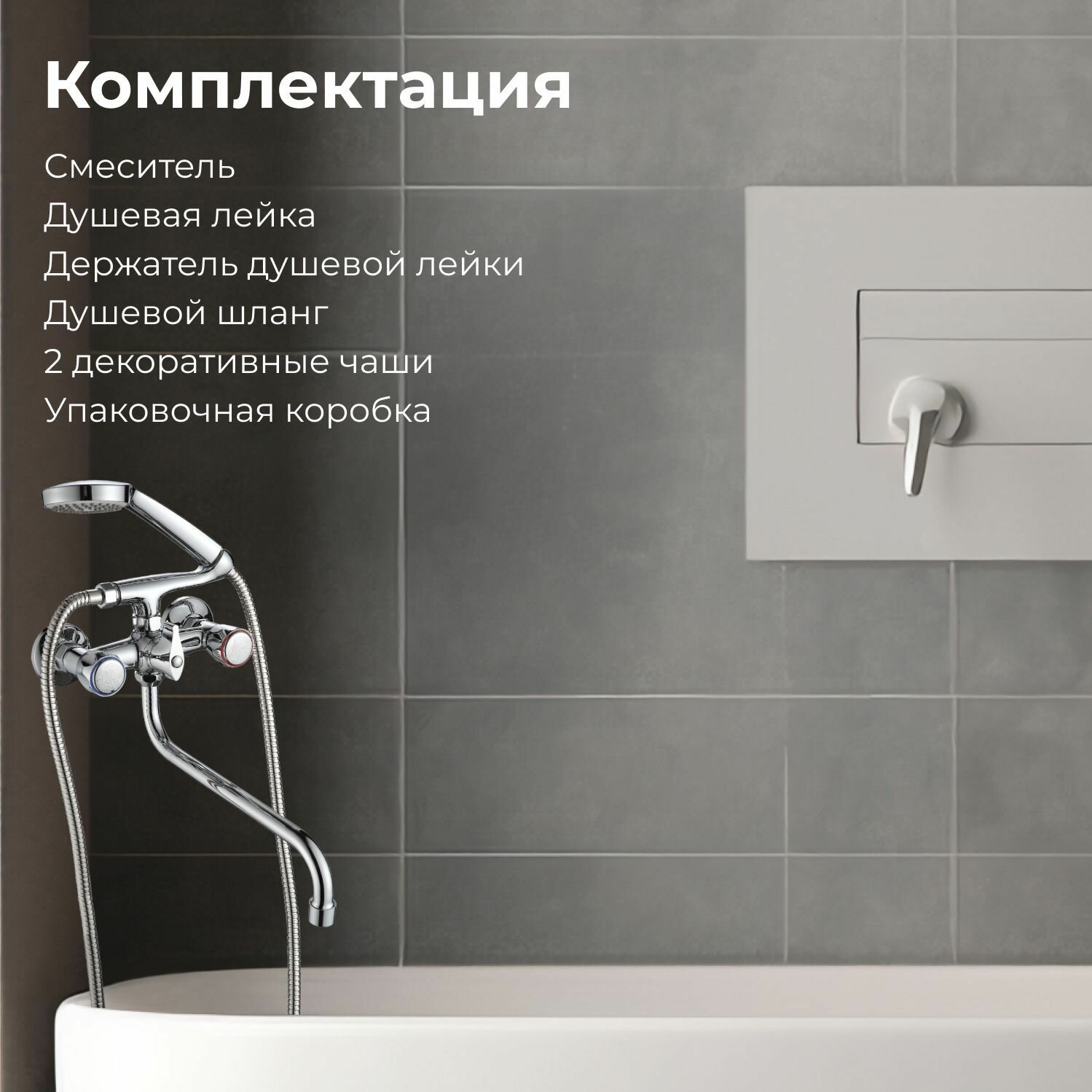 | Комплектация | Душевая лейка; Держатель душевой лейки; Душевой шланг; Смеситель; Декоративная чаша, 2 шт (эксцентриков нет) Гарантийный талон; Упаковочная коробка. |