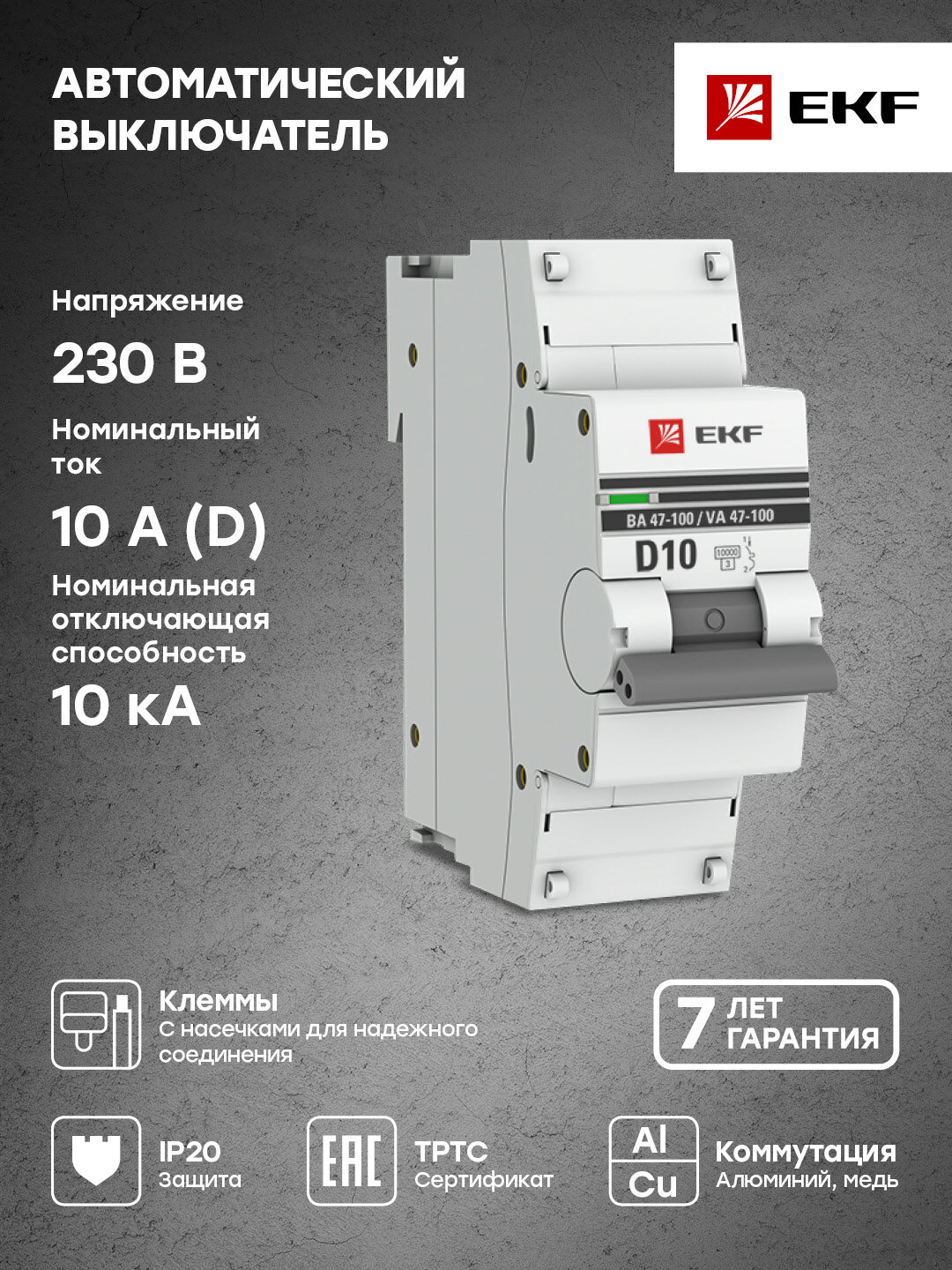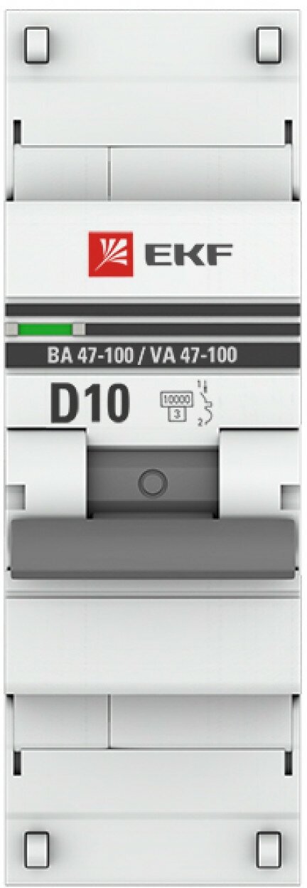 Автомат 10А, тип D, однополюсный 1P, 10kA, cо встроенной опломбировкой клемм EKF PROxima ВА 47-100 (Автоматический выключатель D10)