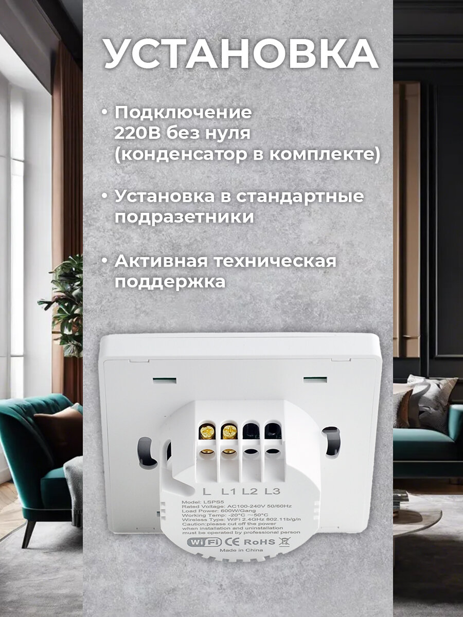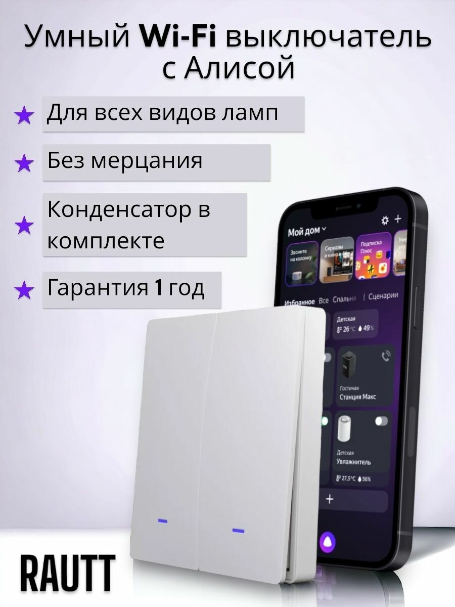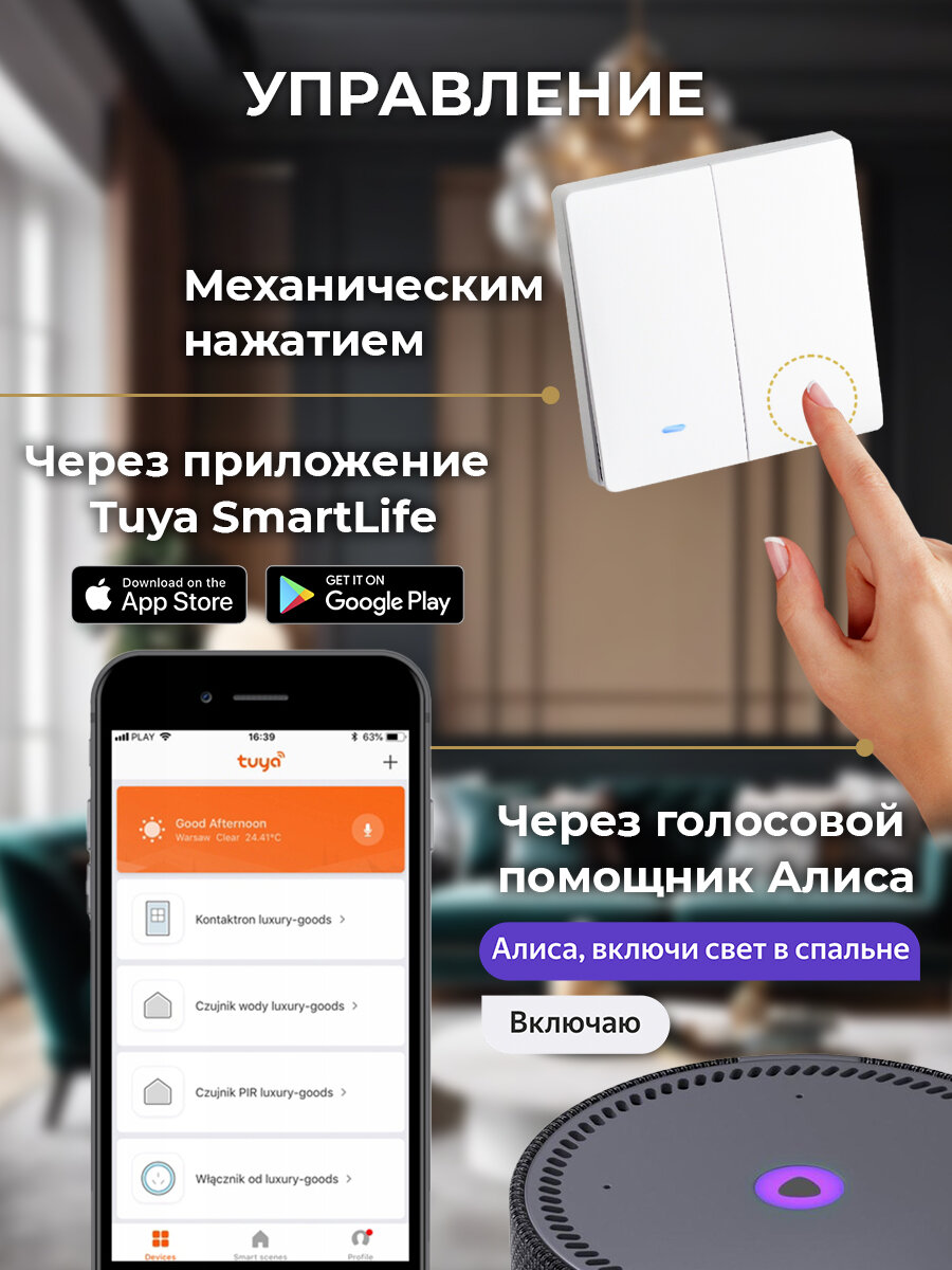 Умный WiFi выключатель с Алисой, 2 клавиши, белый, Tuya Smart Life интересное: