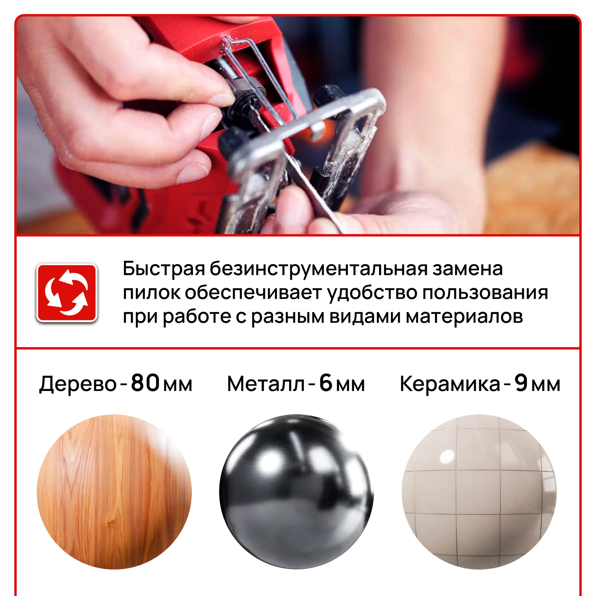 | Особенности конструкции | быстрозажимное крепление пилки / возможность подключения пылесоса / подсветка / сдув опилок |