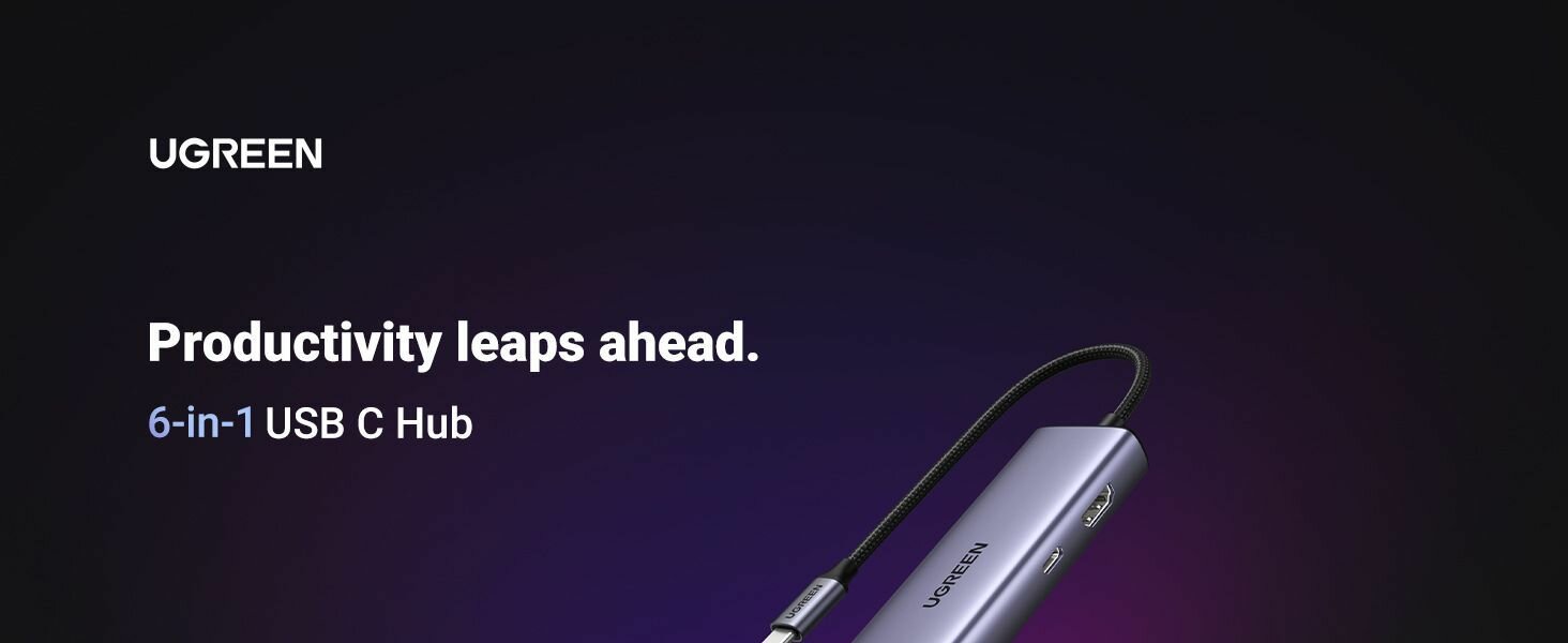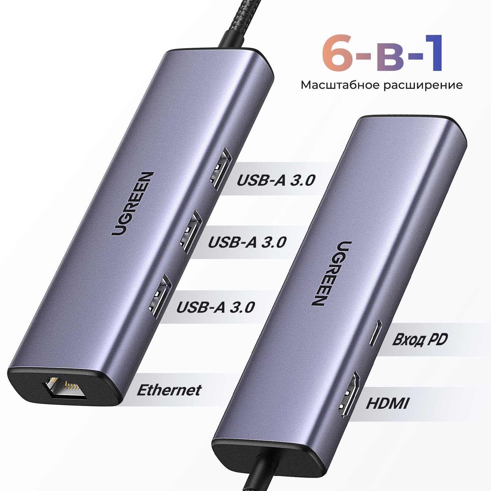 Хаб 6 в 1 Ugreen USB-C CM512, HDMI 4K 30Гц, 3xUSB-A 3.0, LAN RJ45 (1Gbit), PD зарядка 100Вт, серый космос (15598)