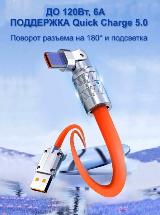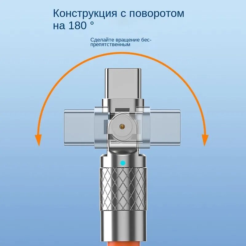 Вращающийся кабель на 180 градусов Type-C для зарядки, 1.5 метра, 6 ампер, 120w, индикатор, ремешок, цинк (Оранжевый) интересное: