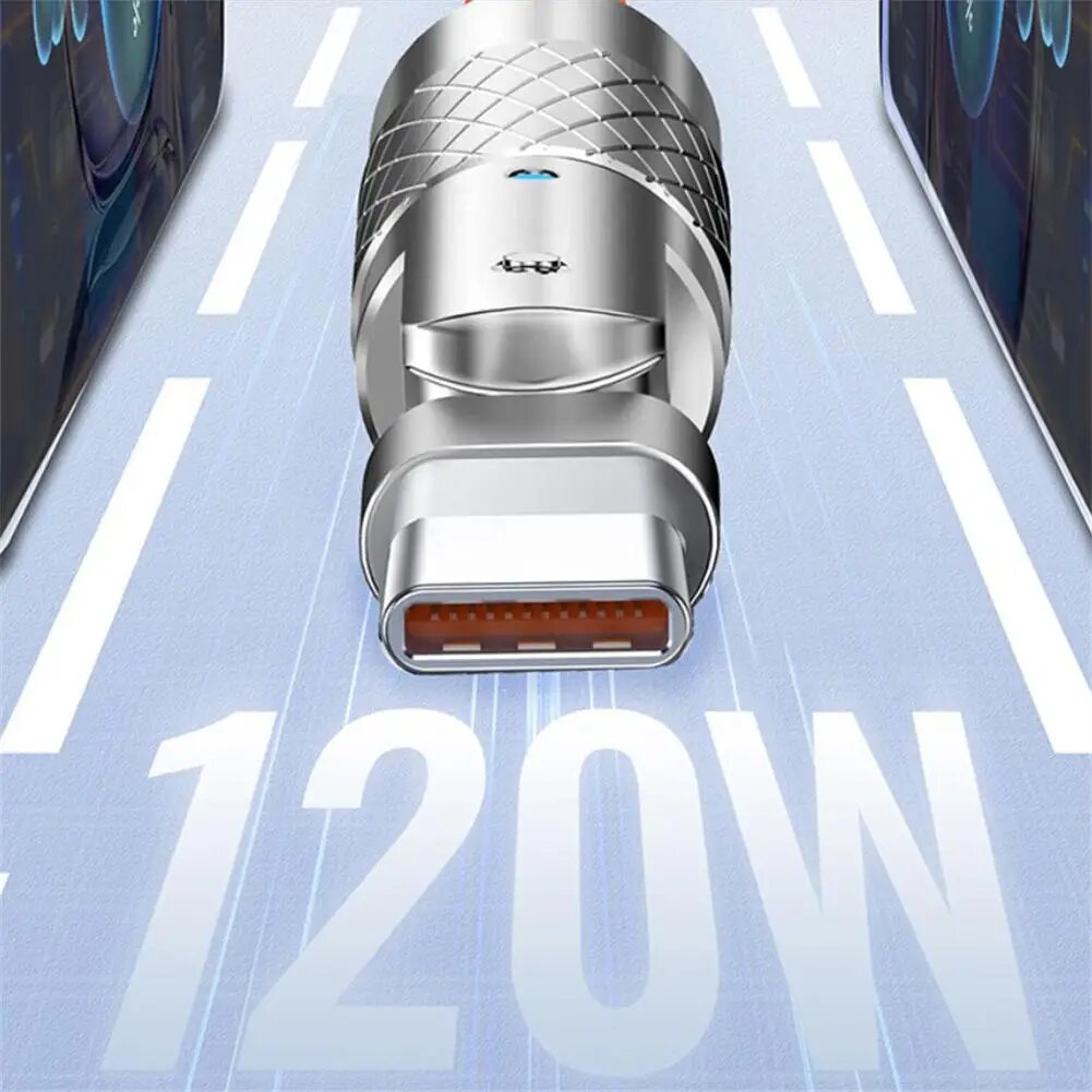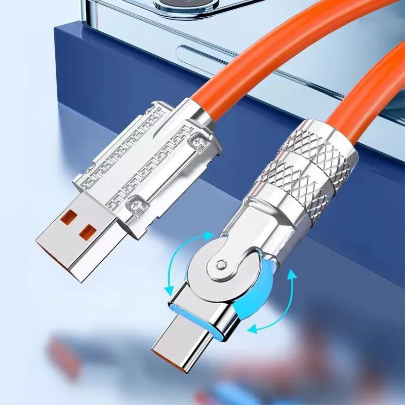 Купить Вращающийся кабель на 180 градусов Type-C для зарядки, 1.5 метра, 6 ампер, 120w, индикатор, ремешок, цинк (Оранжевый)