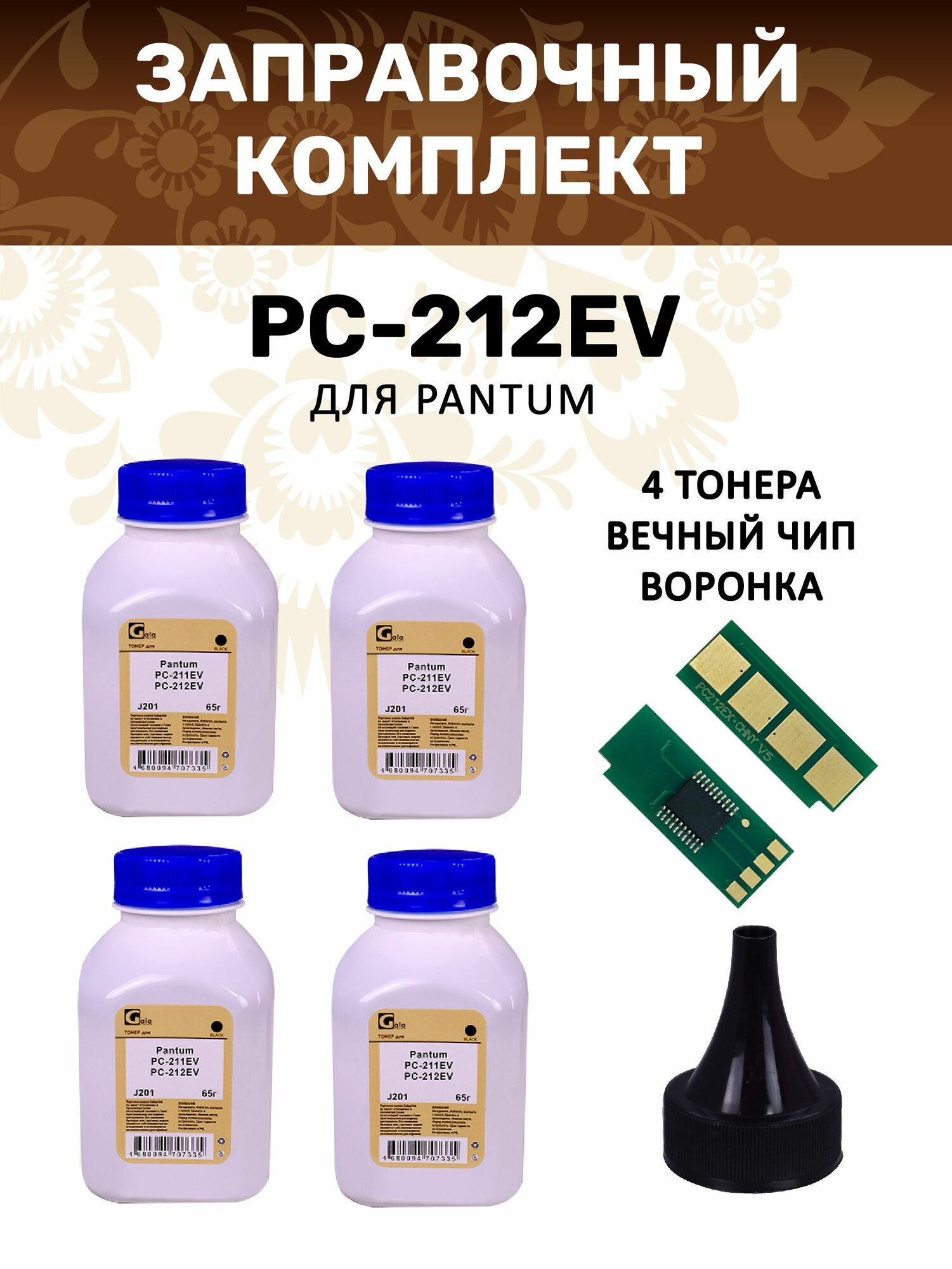 Заправочный комплект GalaPrint PC-212EV (вечный ЧИП + тонер 65гр 4 шт + воронка) для принтеров Pantum P2502/M6502/M6552 интересное: