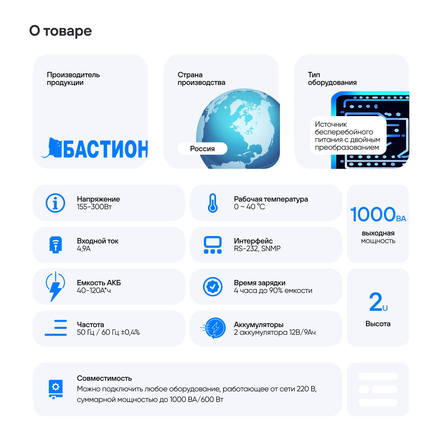 ИБП Бастион SKAT-UPS 1000 RACK 2U 1000W 160-300V IP20 интересное:
